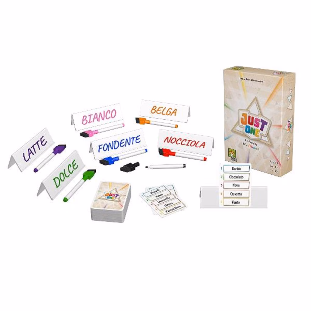 Gioca con i tuoi amici per scoprire più parole Mistero possibili! Just One è un party game cooperativo. Insieme agli altri, fai indovinare una parola Mistero a uno dei giocatori scrivendo segretamente un indizio sul tuo cavalletto. Scegli il tuo indizio senza metterti d'accordo con gli altri e dai prova di originalità cercando di non scrivere lo stesso indizio di un altro giocatore. Tutti gli indizi identici, infatti, vengono annullati ancora prima che il giocatore attivo possa vederli. Alla fine della partita, calcola il punteggio in base al numero di parole Mistero indovinate.