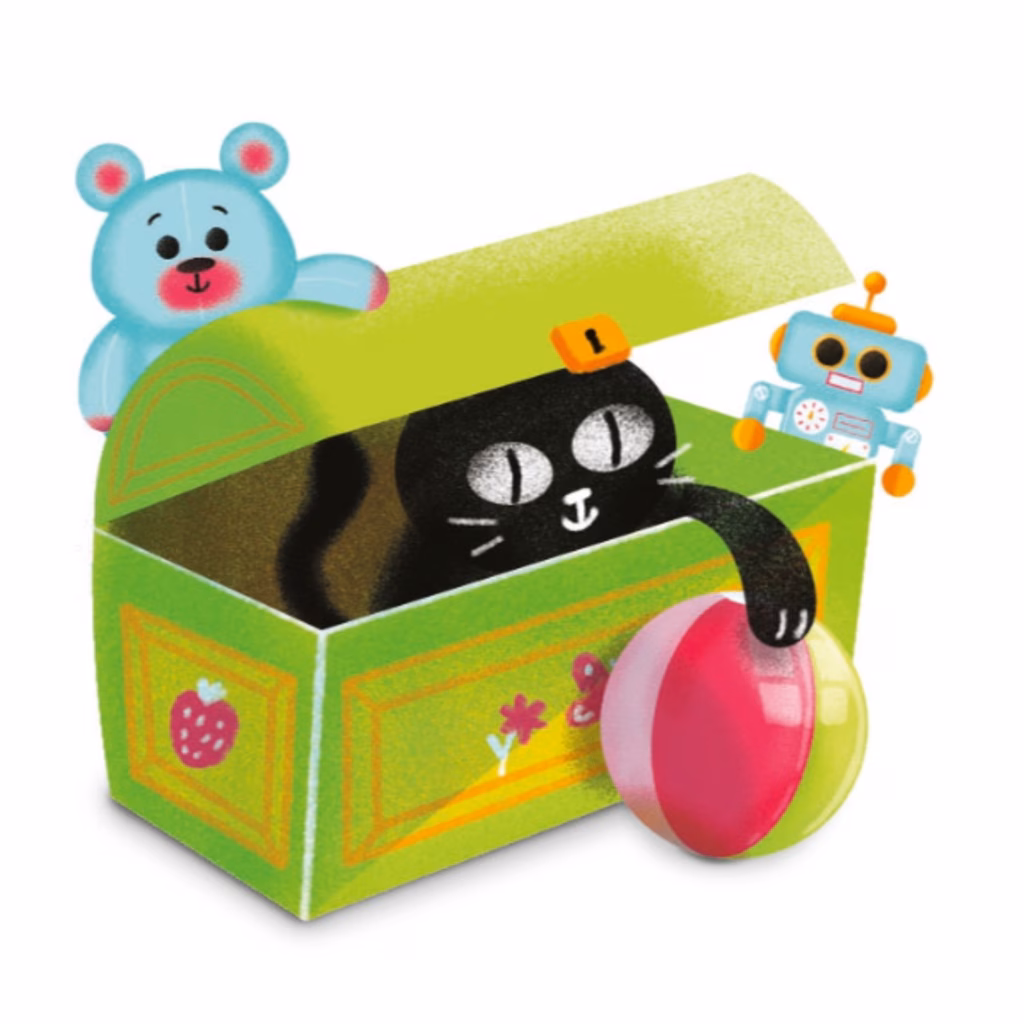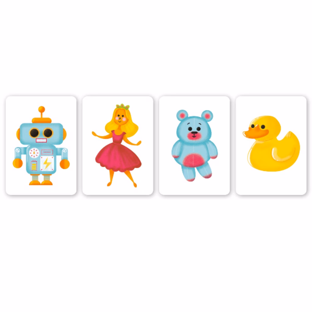 Contiene 40 carte da gioco con illustrazioni di giocattoli al posto dei numeri, per aiutare il bambino ad associare le carte attraverso le figure.