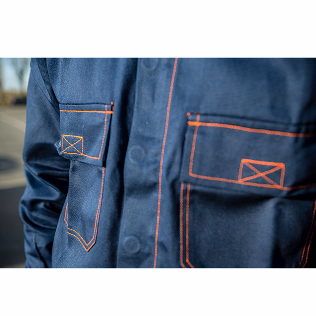 Giubbino da lavoro Platino con Bottoni coperti - due tasche davanti chiuse da velcro - velcro ai polsi - cuciture a contrasto arancio (no hv) su tutto il giubbino - Composizione tessuto: 100% cotone sanforizzato Grammatura tessuto: 250 g/m²