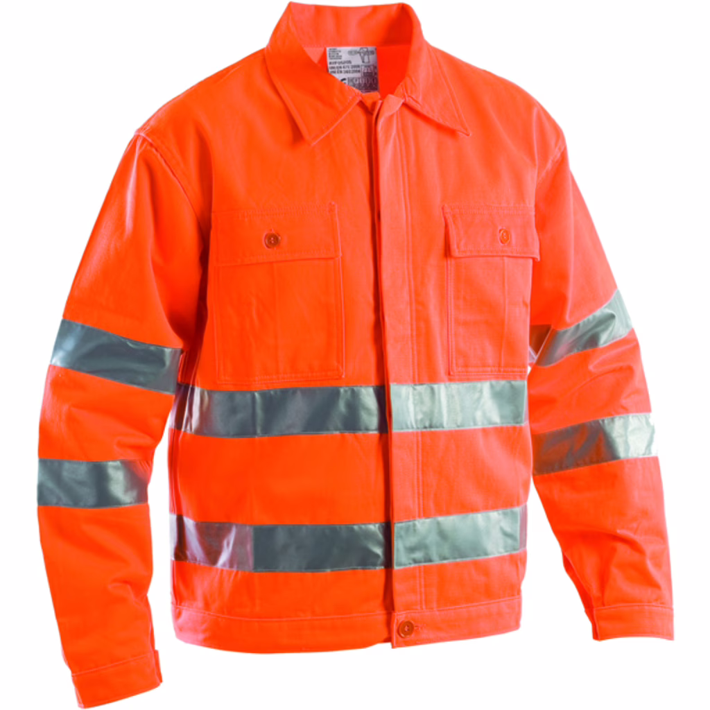 Giubbotto con collo a camicia - chiusura anteriore con bottoni coperti, elastico ai fianchi - due tasche al petto applicate chiuse con pattina e bottone - polsini fondo manica chiusi con bottone - capo confezionato con bande rifrangenti - doppie cuciture nei punti di maggior sforzo