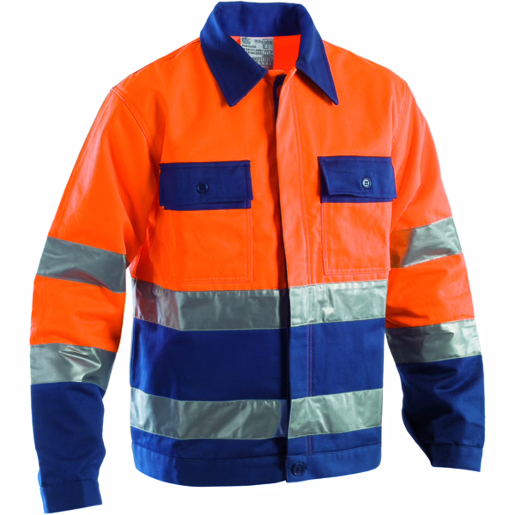 Giubbino alta visibilità con bande rifrangenti - collo a camicia - chiusura anteriore con bottoni coperti - due tasche al petto applicate chiuse con pattina e bottone - polsini fondo manica chiusi con bottone - doppie cuciture nei punti di maggior sforzo - certificato per 50 lavaggi