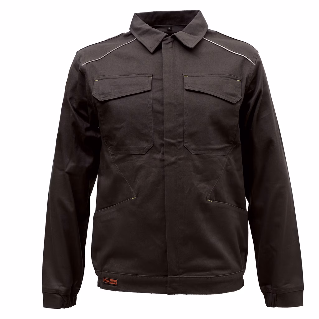 Giacca con collo a camicia stretch cotone 98% / elastane 2%. Chiusura sul davanti con zip coperta. 2 tasche al petto chiuse con patta e velcro. 2 tasche ai fianchi chiuse con velcro. Elastico interno su fondo giacca e polsi. Travette a contrasto di colore giallo. Inserti riflettenti su spalline.
