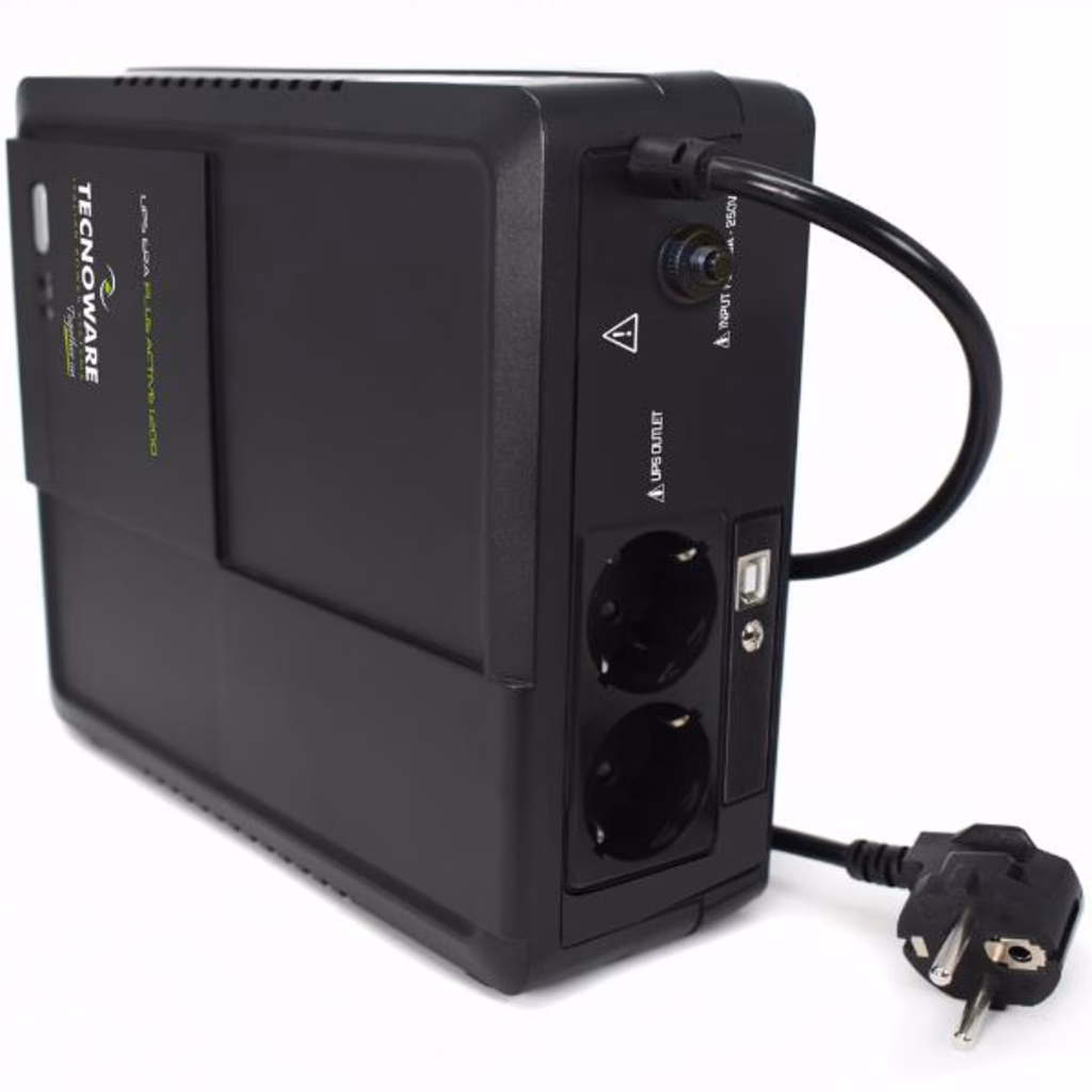 Gruppo di continuità UPS ERA PLUS ACTIVE 1200, Batteria da 12V 9Ah, Dispone di 1 Cavo fisso d'ingresso SCHUKO e 2 uscite SCHUKO protette da Black-Out, sovratensioni e sottotensioni. Tecnologia Line Interactive Plus. Dimensioni 20,7x8,2x22,8 cm, peso 2,7 kg. Dotato di Tasto On-Off con LED multifunzione integrato ad allarme sonoro per la segnalazione dello stato di funzionamento e di interfaccia usb per il controllo gruppo di continuità ups e la programmazione di accensione/spegnimento tramite il software gratuito Tecnomanager Win/Mac. Studiato per proteggere i dispositivi dotati di alimentatore con PFC Attivo come Personal Computer, Console Game, Local Area Networks (LAN) e Sistemi di Sorveglianza. Totalmente silenzioso.