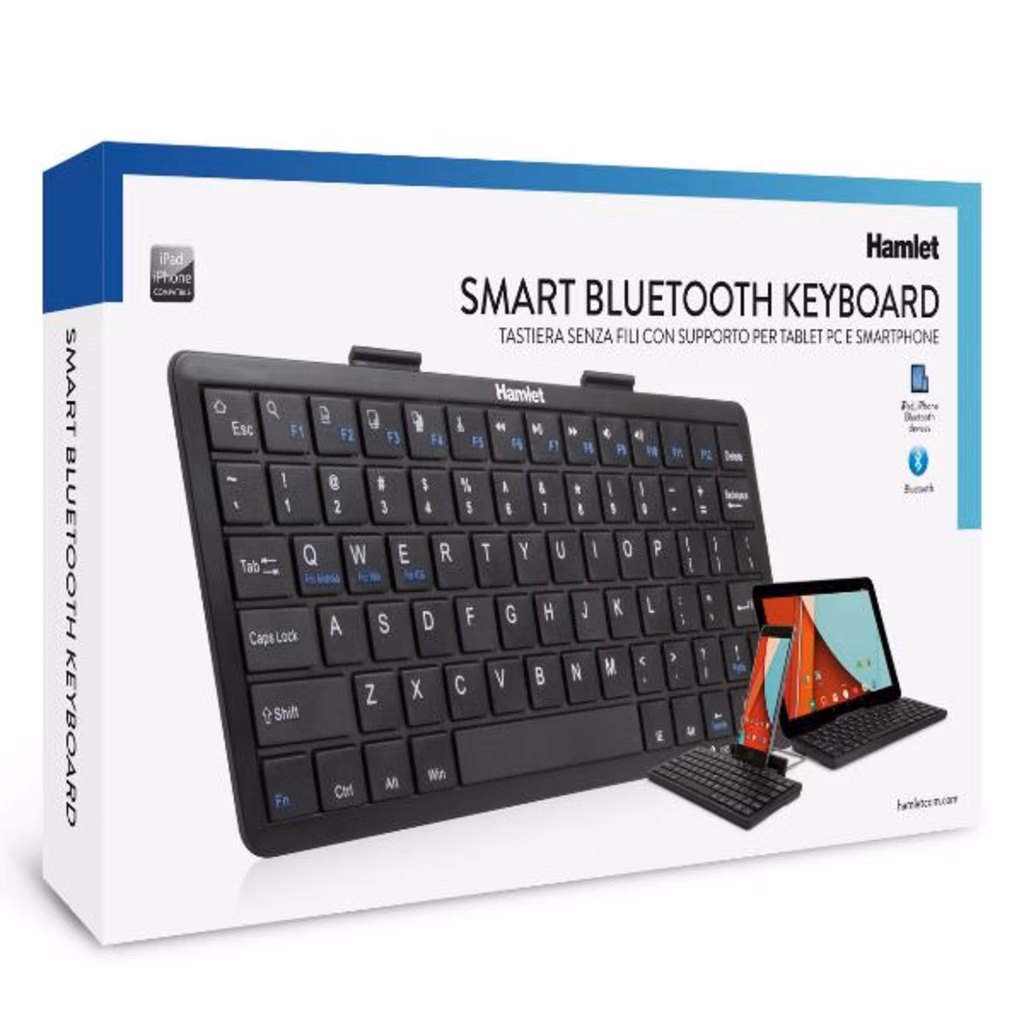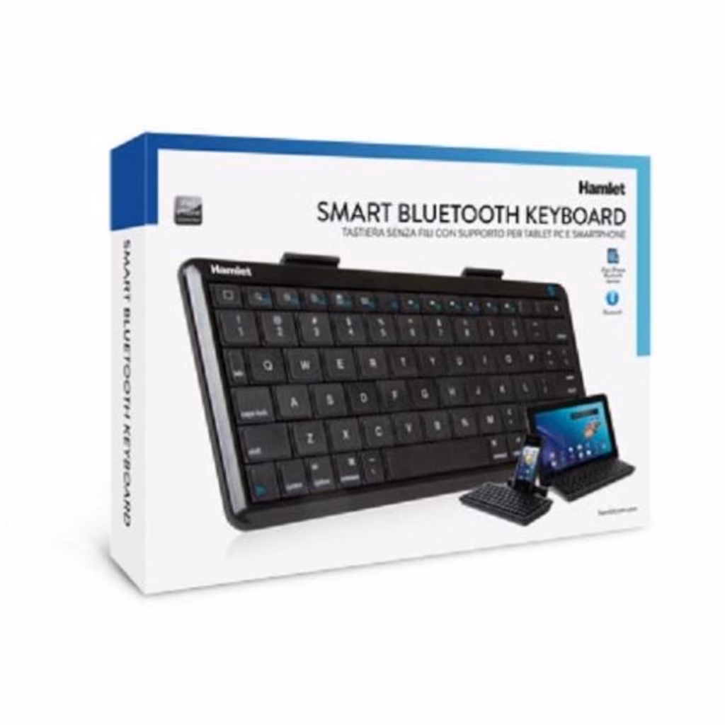Hamlet Smart Bluetooth Keyboard è una tastiera con tecnologia Bluetooth integrata, ideale per utilizzare i dispositivi compatibili Bluetooth come Tablet PC e Smartphone con la comodità di una tastiera. La batteria interna ricaricabile al litio garantisce un prolungato utilizzo del dispositivo (cavo USB riavvolgibile di ricarica in dotazione). Il supporto removibile di cui è dotata, grazie ai 2 diversi adattatori di spessore, permette di utilizzare Tablet PC e Smartphone mantenendo questi dispositivi in una posizione confortevole per la massima comodità di utilizzo.