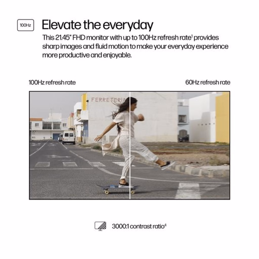 Scegli un'esperienza di lavoro quotidiana più piacevole e produttiva, con tanto spazio in più per progetti e assegnazioni. Questo elegante monitor FHD da 21,45 pollici vanta un rapporto di contrasto ottimizzato di 3000:1 e una frequenza di refresh fino a 100 Hz, per immagini nitide e fluide.