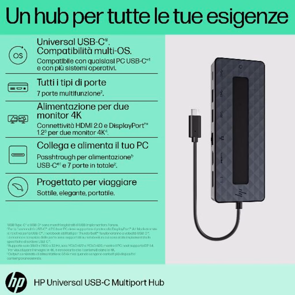 Accedete a un mondo di possibilità con HP Universal USB-C Multiport Hub, che ora supporta qualunque PC compatibile con USB-C®. 7 porte, 1 cavo passthrough per alimentazione e trasferimento e numerose porte per tutte le vostre esigenze. Supporta inoltre due monitor 4K tramite HDMI 2.0 e 1 DisplayPort 1.2. Tutto il necessario per restare connessi in un unico hub.