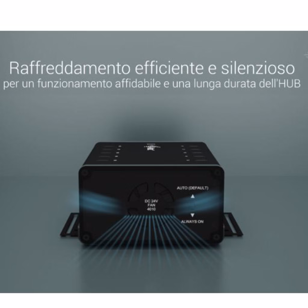 Adattatore di alimentazione integrato da 180 W 10 porte USB-C, tutte con supporto di ricarica a 15 W 2 porte offrono velocità di trasferimento dati fino a 5 Gbps 8 porte offrono velocità di trasferimento dati fino a 480 Mbps Protezione da sovratensione e corrente Include un set di staffe metalliche per l installazione fissa opzionale su tavolo.