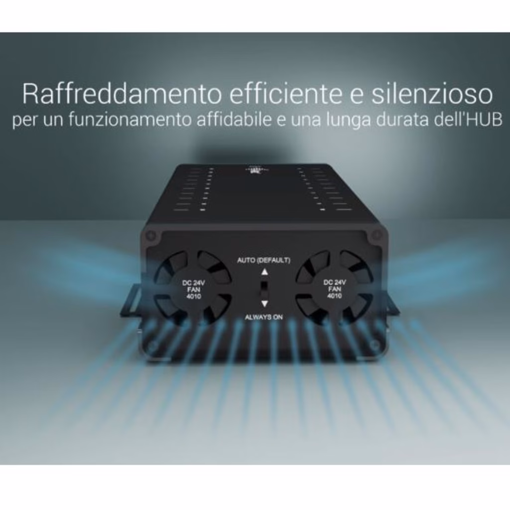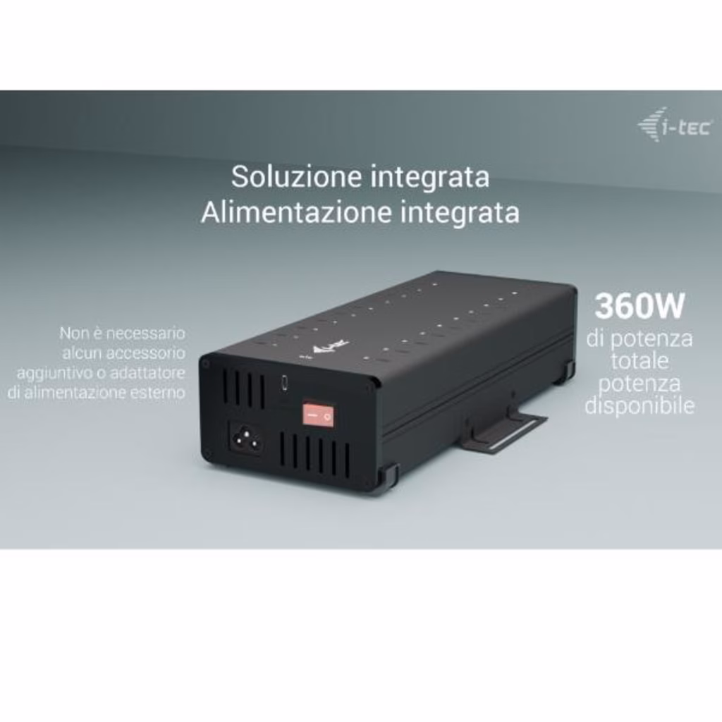 Adattatore di alimentazione integrato da 360 W 20 porte USB-C, tutte con supporto di ricarica a 15 W 2 porte offrono velocità di trasferimento dati fino a 5 Gbps 18 porte offrono velocità di trasferimento dati fino a 480 Mbps Protezione da sovratensione e corrente Include un set di staffe metalliche per l installazione fissa opzionale su tavolo.
