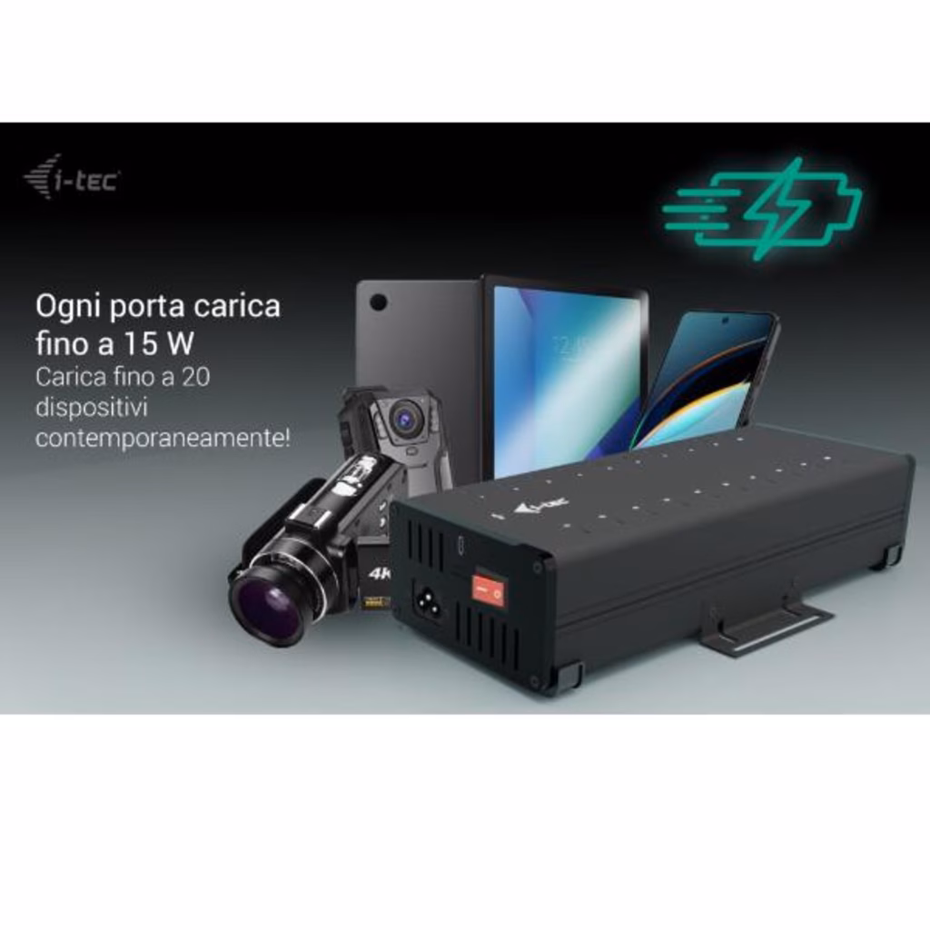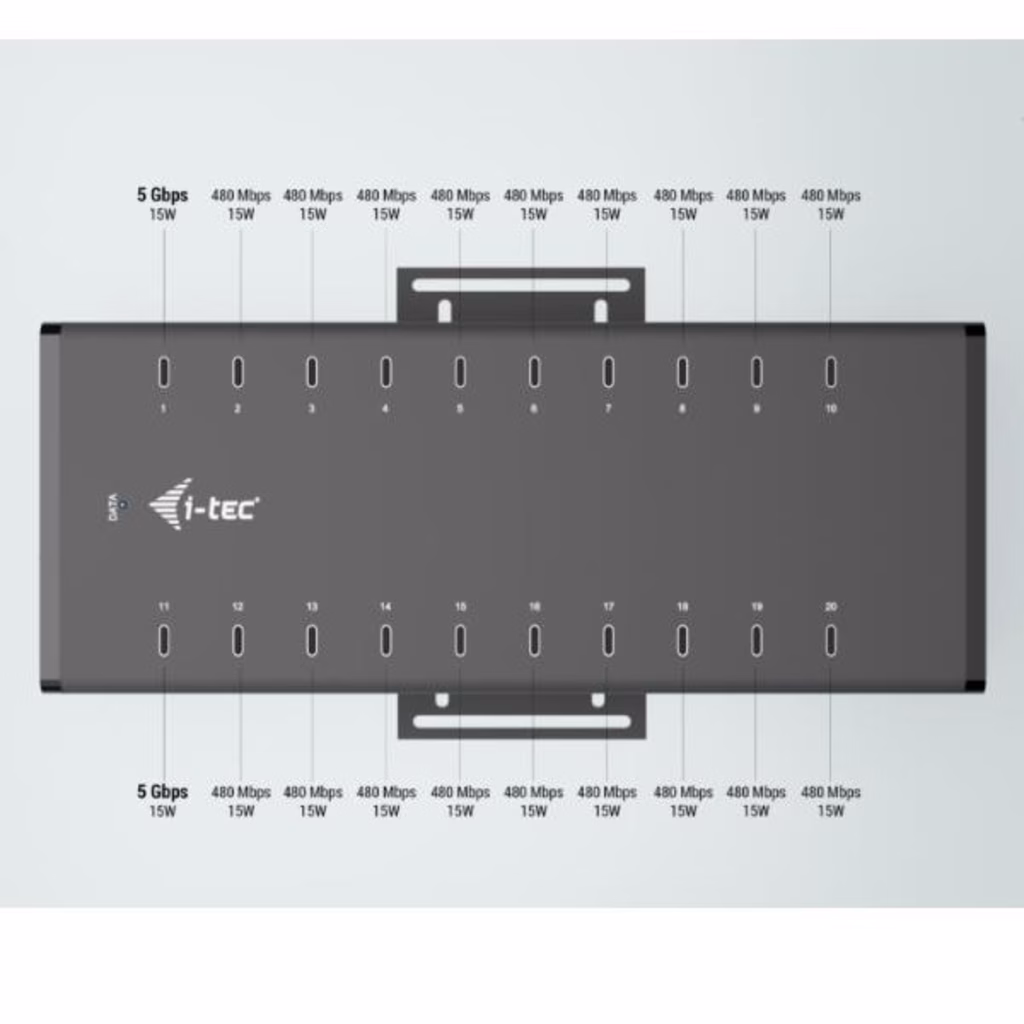 i-tec USB-C/USB-A Metal Charging + data HUB, 15W per port, 20x USB-CQuesto moderno HUB offre 20 porte USB-C con funzionalità Plug & Play e ricarica fino a 15W per porta. Con 20 porte USB, l HUB può caricare fino a 20 dispositivi contemporaneamente.