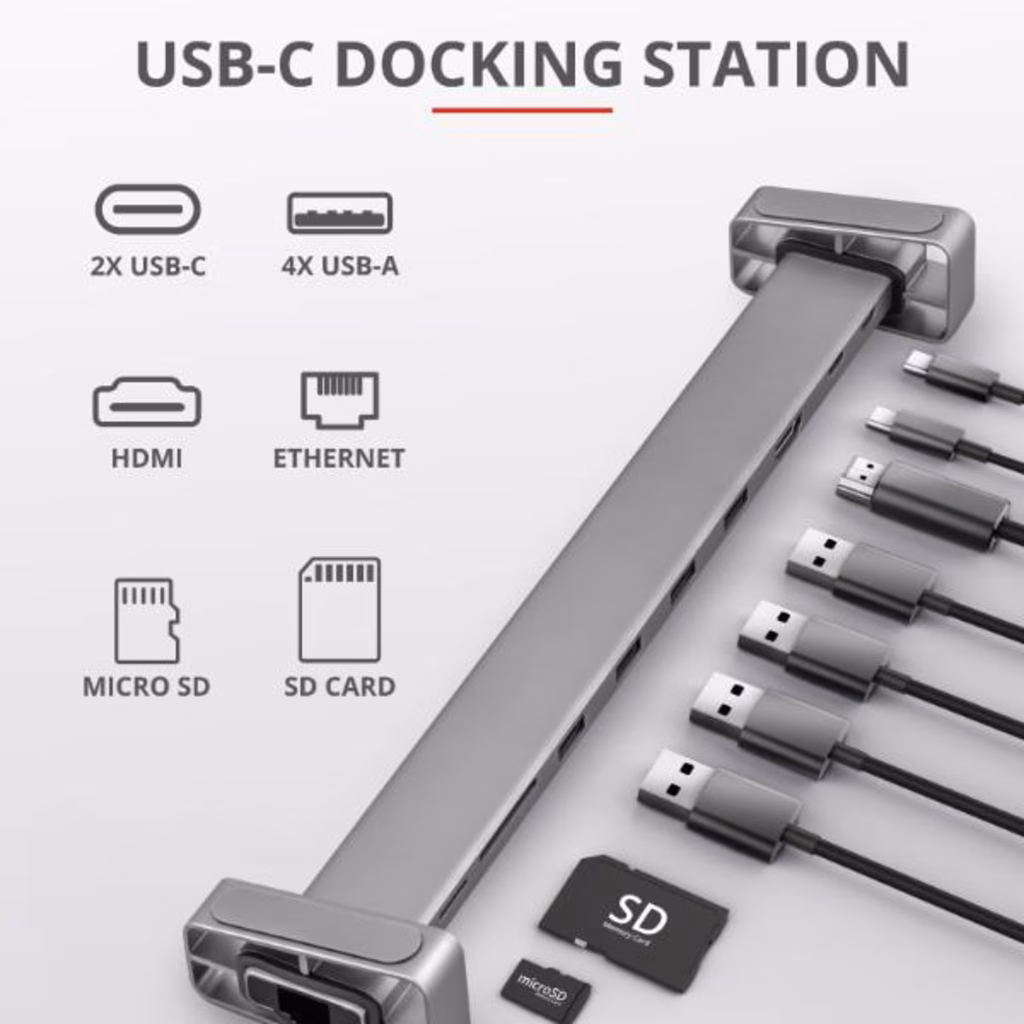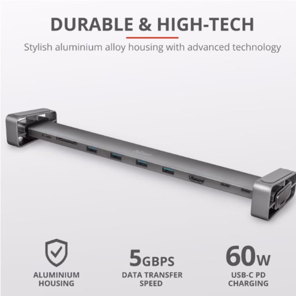 Con la docking station multiporta USB-C 10-in-1 Trust Dalyx, è davvero possibile trarre il massimo dal laptop. Si può aumentare il numero di porte sul laptop e collegarsi con più dispositivi attraverso USB-C, HDMI, USB-A e una porta di rete, oltre a importare dati mediante un lettore di schede.