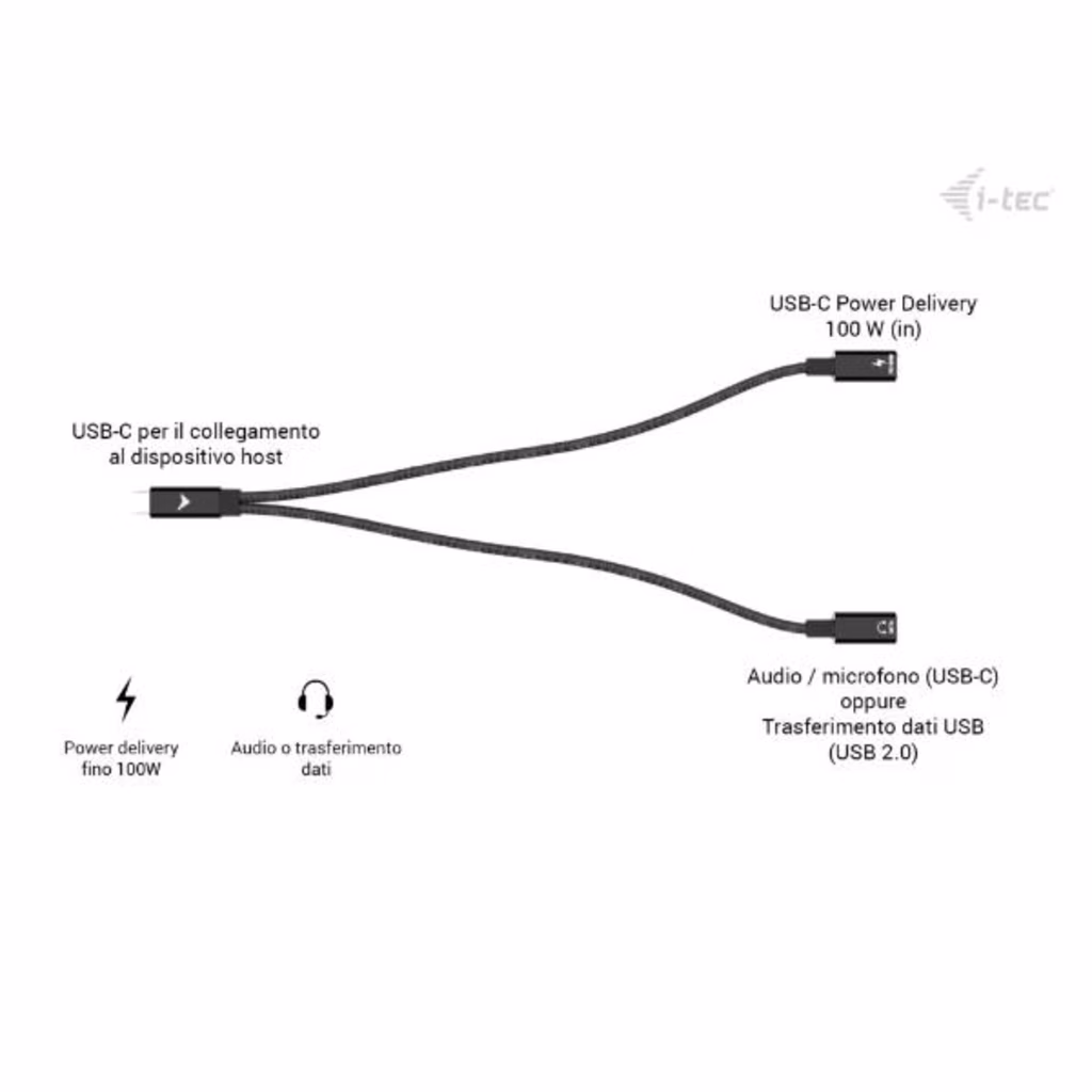 SPECIFICHE TECNICHE:1 cavo splitter USB-C (30 cm) per il collegamento al dispositivo host, suddiviso in:1 ingresso USB-C PD da 100 W1 USB-C 2.0 per audio/microfono o dati (480 Mbps)Potenza erogata: 100 WCompatibilità con sistemi operativi: Windows 10/11, macOS, iPadOS, Android, ChromeOS, LinuxDimensioni del prodotto: 13 x 8 x 300 mmPeso del prodotto: 20 gRequisiti hardware:Dispositivo con USB-C, USB4 o Thunderbolt 3,4 e 5 liberoRequisiti di alimentazione:Dispositivo con USB-C, USB4 o Thunderbolt 3,4 e 5 libero con supporto Power DeliverySistema operativo:Windows 10 / 11, macOS, Android, iPadOS, ChromeOS, Linux