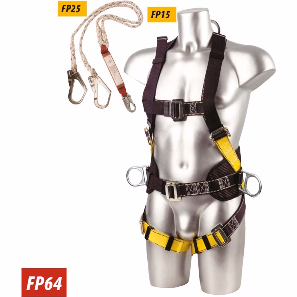 Kit contenente: - Imbracatura Comfort Plus a due punti di ancoraggio - Cordino doppio con assorbitore di energia, gancio a scatto e due ganci da ponteggio - Borsa a tracolla in nylon