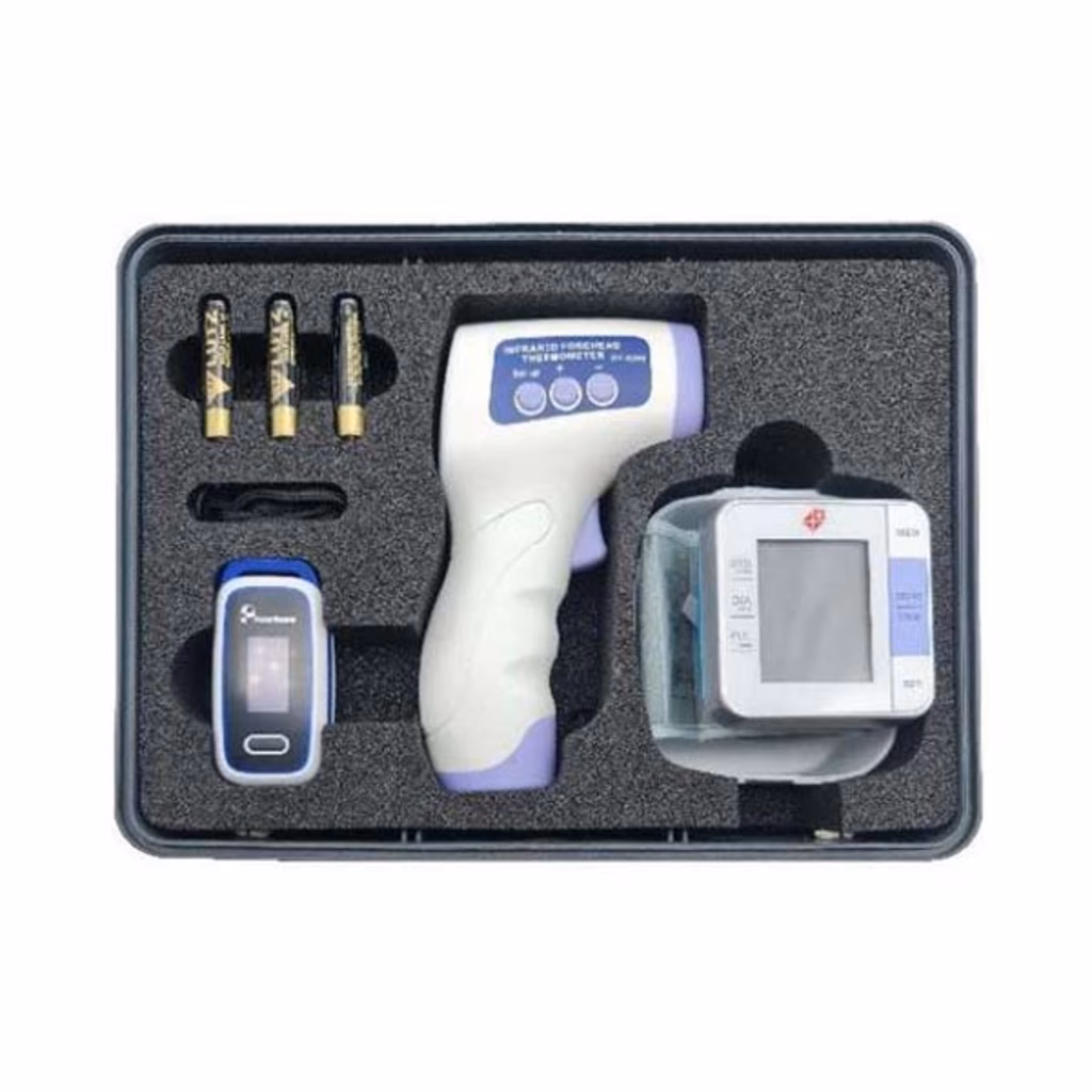 Kit diagnostico che ogni azienda e famiglia dovrebbe avere per la misurazione di Pressione sanguigna, valori di ossigeno nel sangue e misurazione della temperatura corporea. Questi strumenti sono posizionati all'interno di una valigetta realizzata in PP (polipropilene), dotata di termoformato per facilitare la custodia e il trasporto degli strumenti sopra citati e per le rispettive batterie AAA (6). Contiene: - pulsossimetro - termometro ad infrarossi - misuratore di pressione elettronico da braccio