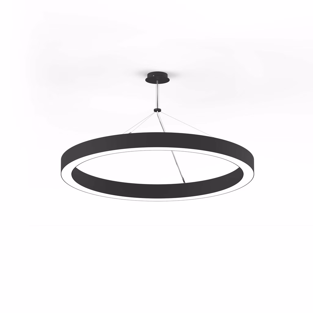 Corpo faro ad anello in profilo di alluminio estruso arrotolato e senza punti di saldatura; apparecchio con sospensione a fune da 1500 mm (rosone centrale); altezza regolabile sullapparecchio, senza utensili; incl. cavo di alimentazione trasparente; superficie verniciata a polveri nero; inserto luce LED costituito da alluminio verniciato altamente riflettente per una migliore gestione termica; colore della luce 3000 K; binning iniziale MacAdam  3 SDCM; CRI  80; 90 % min. del flusso luminoso dopo 50000 ore di esercizio; LED a efficienza energetica con un'elevata resa cromatica; diffusore HPO (High Performance Opal) per unilluminazione omogenea; fascio luminoso diretto / indiretto per una illuminazione d'accento del soffitto; percentuale indiretta con piastre a flusso luminoso potenziato e massima illuminazione del soffitto; grado protezione IP20; classe isolamento 1 220-240V; sicurezza fotobiologica secondo la normativa IEC 62471 gruppo di rischio RG 0 - Rischio esente; cablaggio interno apparecchio senza alogeni; incl. convertitore DALI-2; disponibile accessorio fonoassorbente; sorgente luminosa sostituibile da tecnici specializzati autorizzati; dispositivo di controllo sostituibile da tecnici specializzati autorizzati;