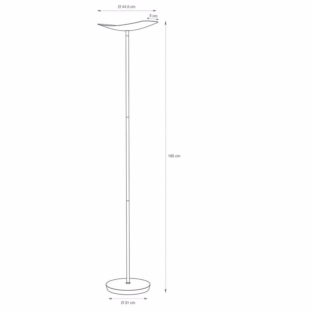 Lampada da terra a luce LED - illuminazione indiretta - interruttore dimmer sul cavo per la variazione di intensità luminosa - diffusore in metallo verniciato - stelo in acciaio lucido - base circolare, zavorrata, in metallo verniciato - potenza max 30 Watt - efficienza luminosa 3000 Lumen - Classe energetica A - dimensioni: diffusore cm. 44,5x21x5h, base Ø cm. 31, stelo cm. 185 - Disponibile nei colori bianco, nero - certificazione CE - garanzia 3 anni.