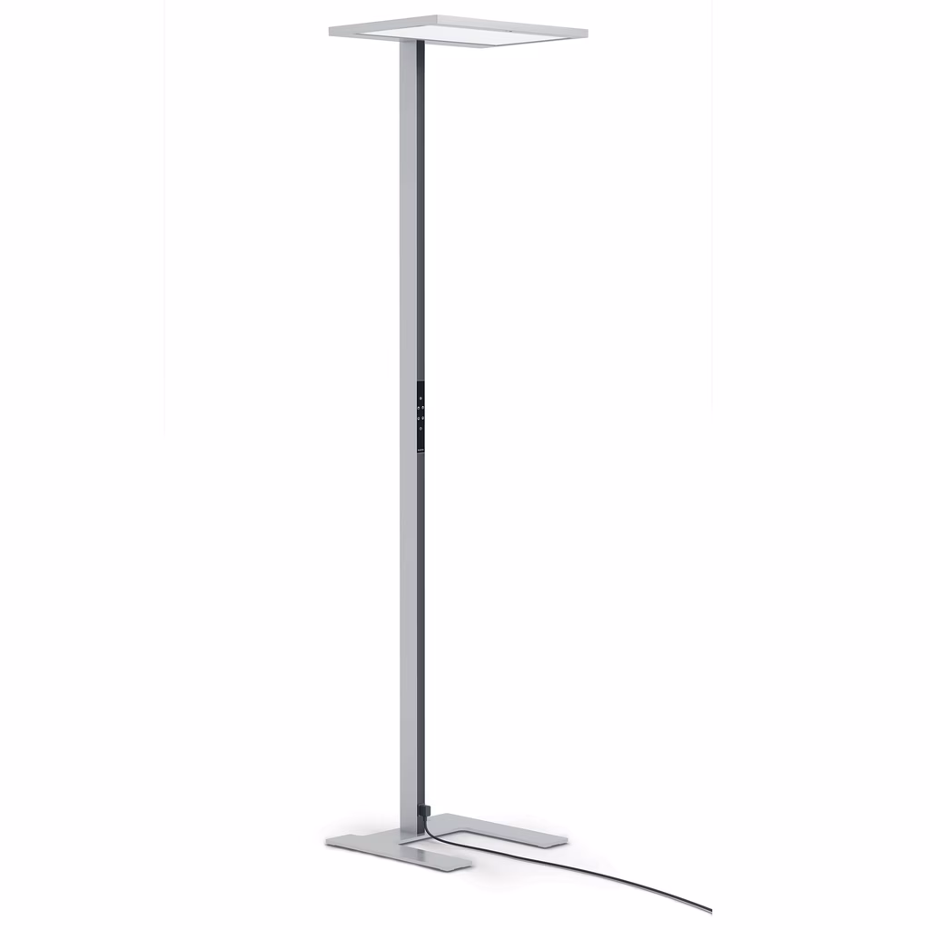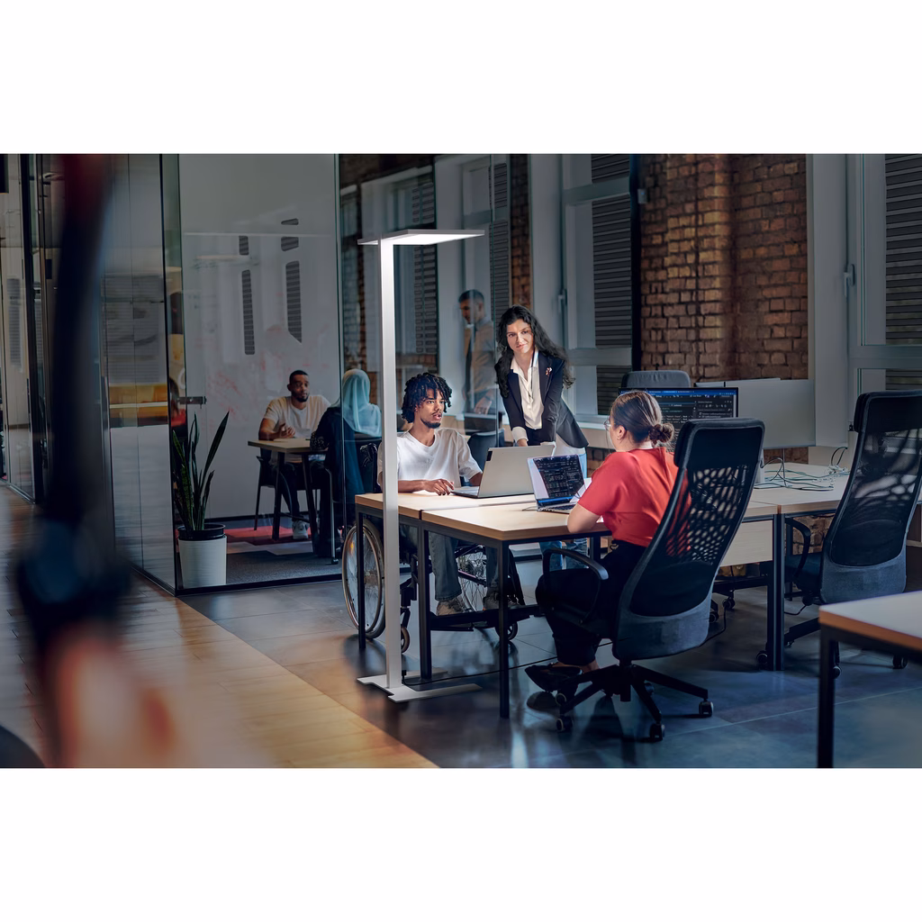Lampada da terra a LED che emula la lucediurna per maggiore comfort visivo, estetica ed ergonomia in ufficio - 12.000 lm per l'illuminazione di uffici fino a circa 16 m² in conformità alle attuali normative, con consumo energetico ottimizzato - Luce con doppia distribuzione asimmetrica per un'illuminazione uniforme e profonda degli ambienti - Miglio comfort visivo e minor affaticamento degli occhi per una maggiore produttività e benessere - Qualità della luce ottimale con temperatura di colore di 4.000 K e indice di resa cromatica RA > 80 - Regolabile a seconda delle proprie esigenze - Controllo separato della luce diretta e indiretta - I sensori permettono di risparmiare energia e ridurre i costi - Lampada con base piatta a forma di U, ideale per scrivanie da ufficio standard - Spina IEC per un comodo posizionamento ed una facile manutenzione e sostituzione - Made in Germany