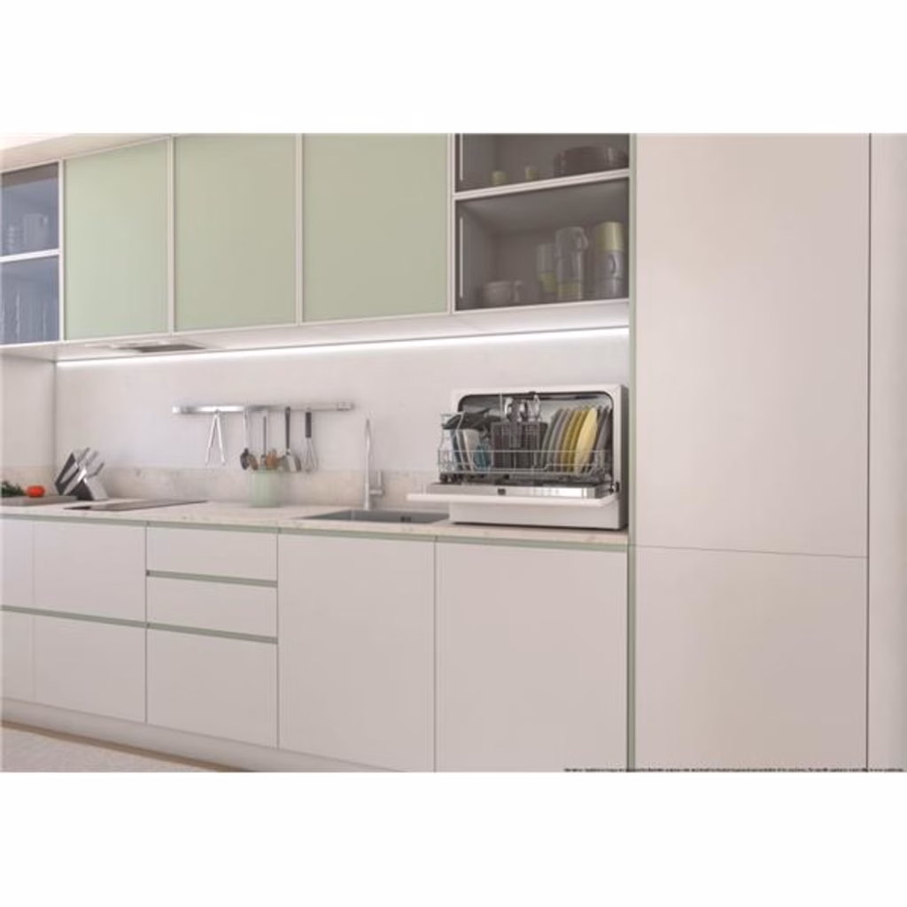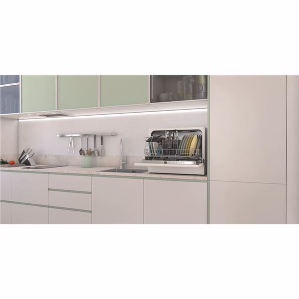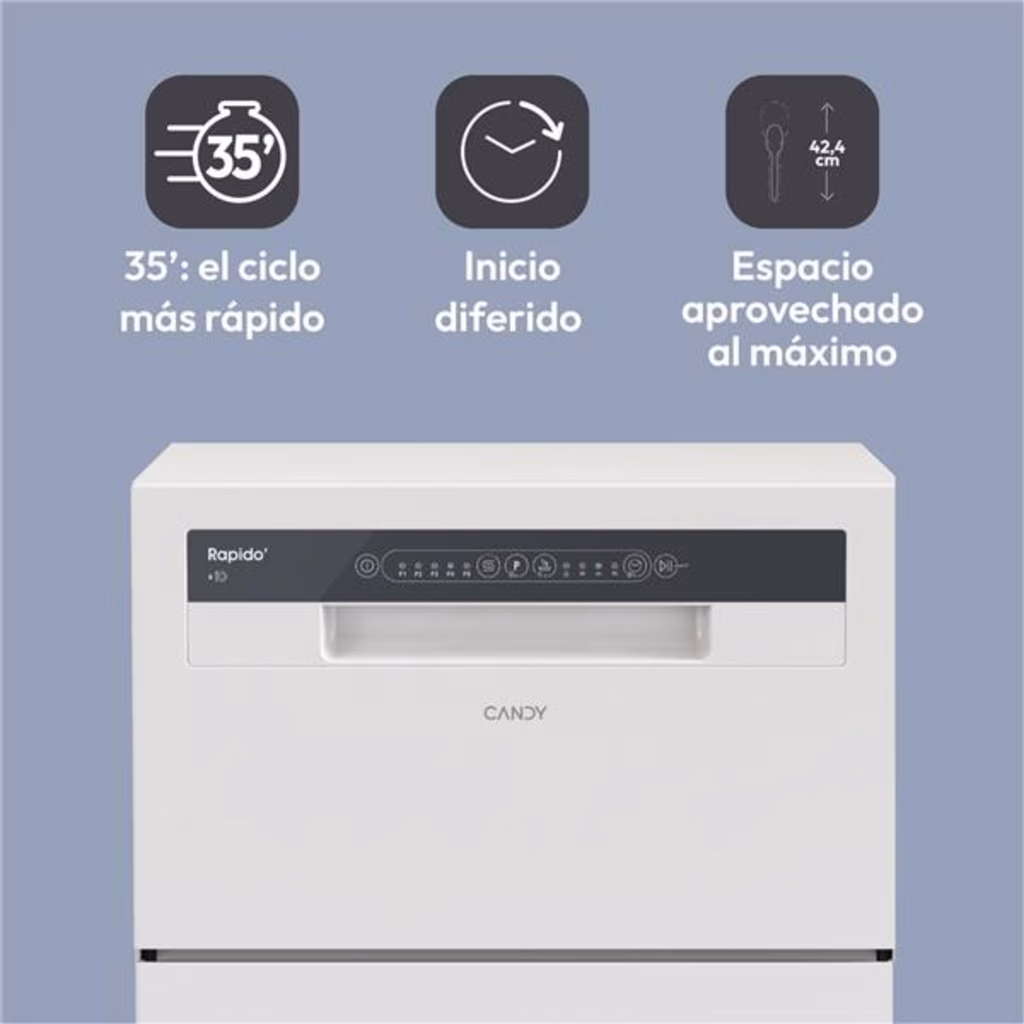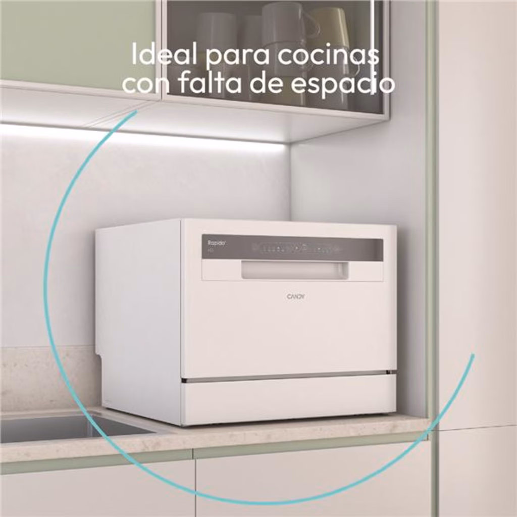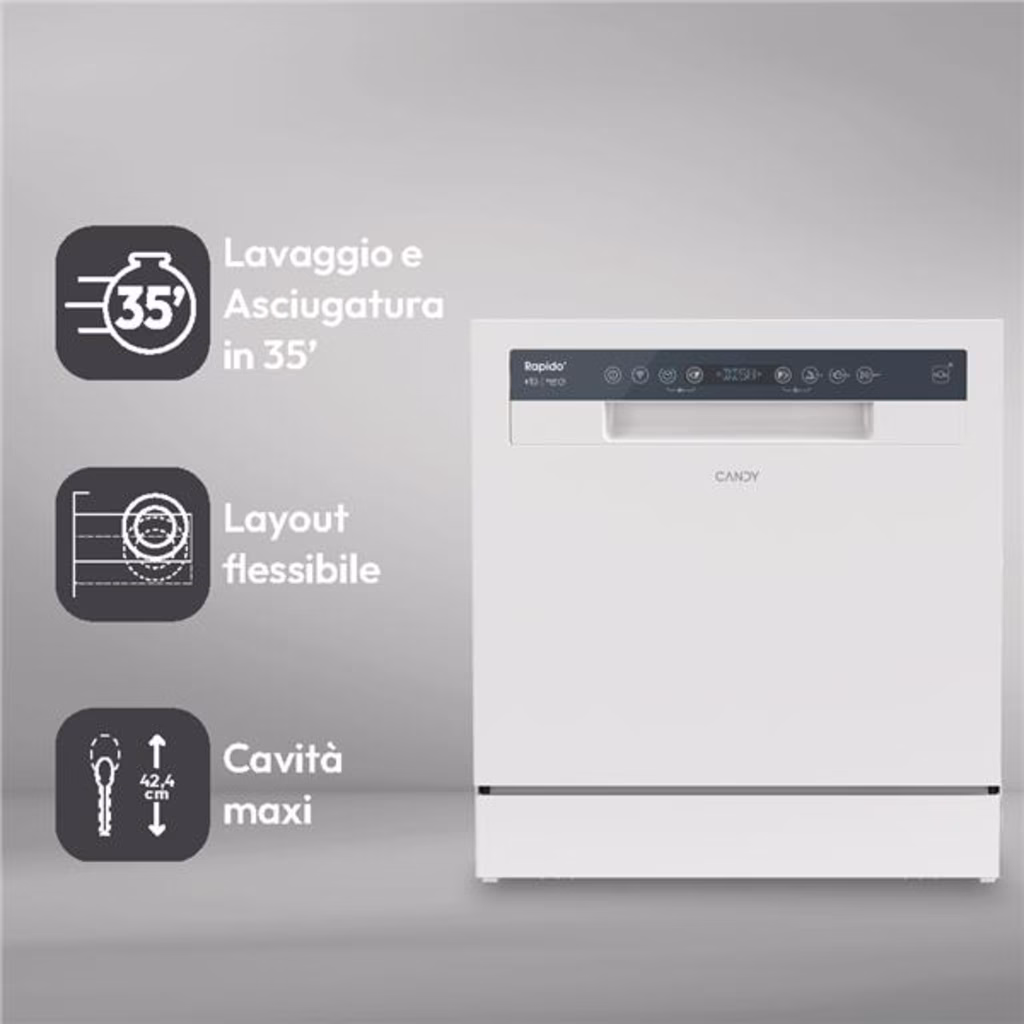 CP 6E51LWRapido' Ecco Candy Rapido', una lavastoviglie da tavolo compatta che fornisce la soluzione perfetta se hai difficoltà a caricare una lavastoviglie di grandi dimensioni. Le sue dimensioni ridotte si adattano perfettamente agli spazi più piccoli della cucina ed è stato migliorato per essere più efficiente e intelligente, vantando una serie di cicli rapidi e funzionalità volte a semplificare la vita quotidiana.Velocizza i tuoi lavori domesticiLa nuova Candy Rapido' ti rende la vita più semplice e veloce. Seleziona l'opzione Express e riduci il programma scelto del 10%.Riduci i consumi con l'opzione Mezzo CaricoNon dovrai più preoccuparti se non riesci a riempire completamente la tua Candy Rapido'. Selezionando l'opzione Mezzo Carico ridurrai il consumo di energia e acqua fino al 10% senza compromettere le prestazioni.Avvia il programma quando vuoiLa nuova Candy Rapido' ti dà la possibilità di ritardare l'orario di inizio del ciclo di lavaggio. Quindi puoi impostare l'avvio del programma con un ritardo fino a 24 ore.La lavastoviglie perfetta per le cucine più piccoleLa nuova Candy Rapido' è la soluzione perfetta per adattarsi agli spazi più piccoli della cucina: pur misurando solo 443 A*550 L*501 P mm, può contenere fino a 30 bicchieri, 28 piatti da dessert o 12 piatti, garantendo sempre ottimi risultati di pulizia.Lava e Asciuga in soli 35 minutiLa nuova Candy Rapido' ha il ciclo di lavaggio e asciugatura più veloce sul mercato: può eseguire un intero ciclo per una quantità giornaliera di stoviglie in soli 35 minuti.Posiziona gli utensili più lunghi grazie all'accessorio Maxi LadleIl nuovo Candy Rapido' è dotato del nuovo accessorio Maxi Ladle, con il quale potrai riporre utensili lunghi come coltelli e mestoli, offrendoti la massima flessibilità.