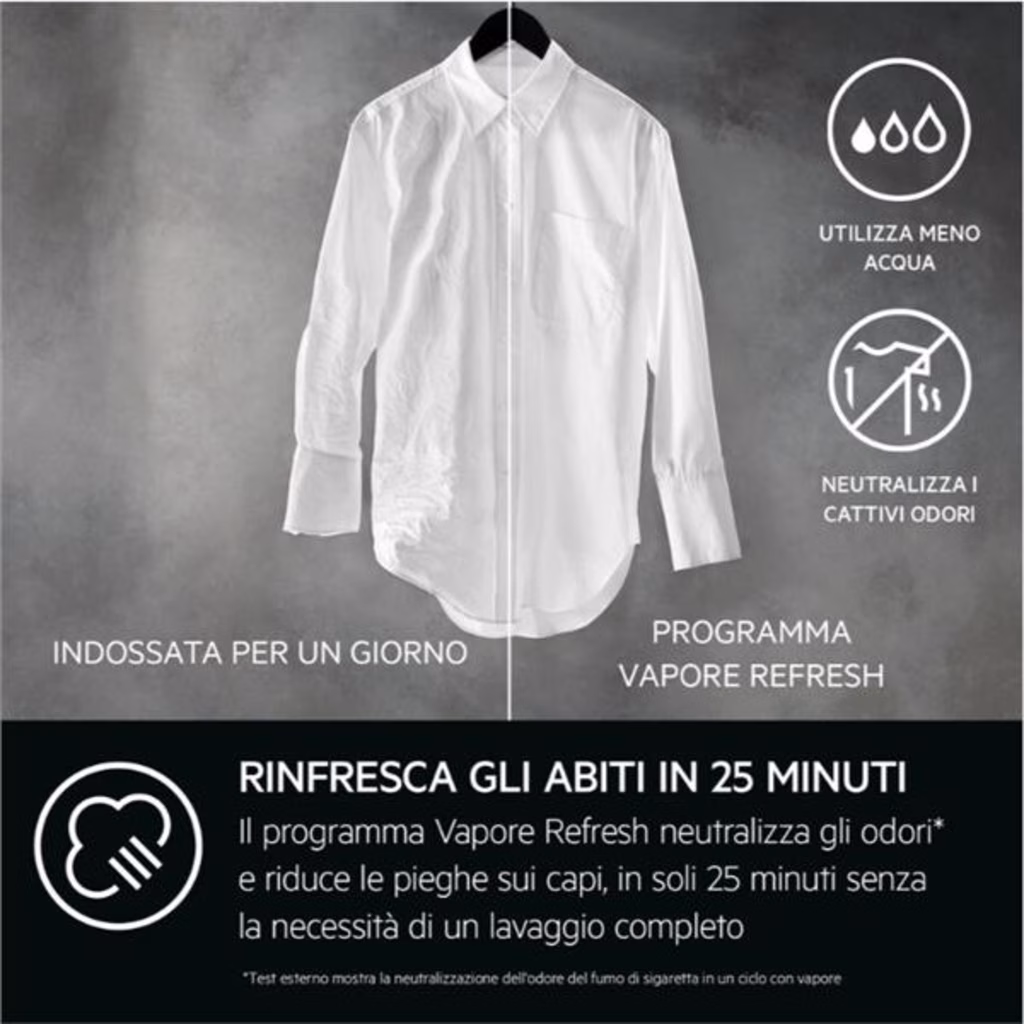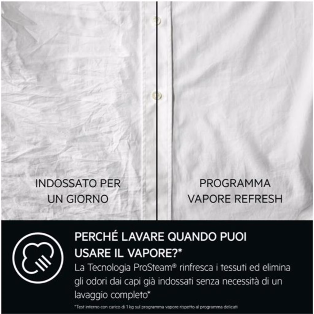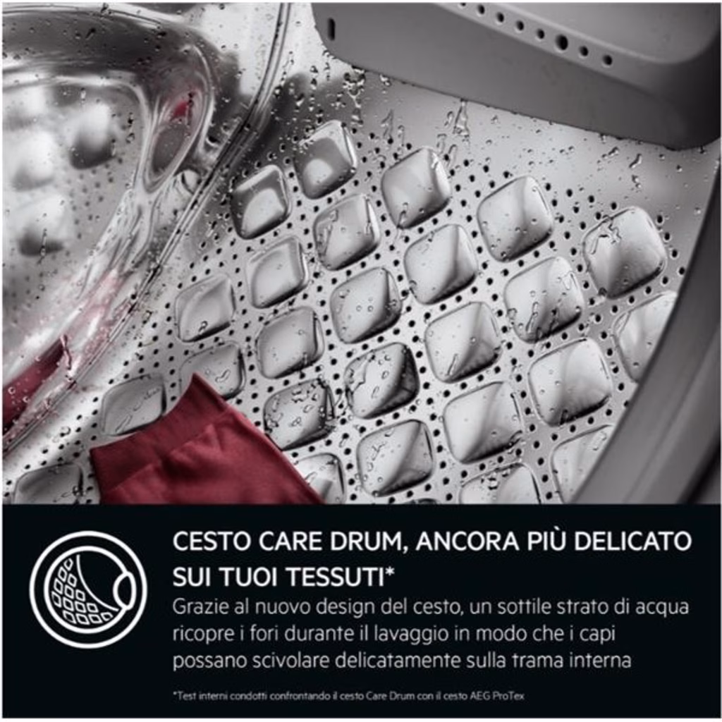 AEG Series 7000 ProSteam lavatrice Caricamento frontale 10 kg 1400 Giri/min Nero, BiancoUSA IL VAPORE INVECE DI LAVARE. IN SOLI 25 MINUTI CON IL 96% D'ACQUA IN MENO*. Il vapore rinfresca rapidamente i tessuti ed elimina gli odori dai capi già indossati, consumando solo 2L d acqua per ciclo. Aggiungendo invece l opzione Vapore Finale al termine di un ciclo di lavaggio, puoi ridurre le pieghe e il tempo di stiratura. * Test interno con un carico da 1 kg con il programma a vapore invece che il programma delicati. CAPI RINFRESCATI*, PIEGHE RIDOTTE Il programma Vapore Refresh neutralizza gli odori* e riduce le pieghe sui capi, inclusi i delicati, in soli 25 minuti senza la necessità di un lavaggio completo. PROGRAMMA MIXLOAD 69MIN, IL PERFETTO EQUILIBRIO TRA TEMPO E PERSONALIZZAZIONE Il programma MixLoad 69min è il perfetto equilibrio tratempo, efficienza energetica e cura dei capi. Indicato per carichi misti fino a 5 kg. Durante il lavaggio, pulisce a 30°C e in soli 69 minuti, offrendo prestazioni ottimali e un bucato eccezionale. TECNOLOGIA PRECISEWASH, CURA PERSONALIZZATA PER I TUOI TESSUTI La tecnologia PreciseWash assicura il miglior trattamento per ciascuno dei tuoi capi, adattando automaticamente il programma al peso di ogni carico. Riduce fino al 40% di energia, tempo e acqua per tutti i carichi più ridotti*. Cesto Care Drum, per capi ancora più morbidi* Il cesto Care Drum permette ai capi di scivolare delicamente sulla trama interna, mentre un sottile strato di acqua ricopre i fori, così da ridurre lo sfregamento e l'usura dei tessuti. Non solo assicura straordinarie prestazioni di lavaggio ma garantisce una cura ancora più delicata. *Test interni che confrontano il cesto Care Drum con il cesto AEG ProTex. IL PROGRAMMA HYGIENE RIMUOVE PIÙ DEL 99,99% DI VIRUS E BATTERI* Certificato Swissatest, rimuove più del 99,99% di virus e batteri* dai vestiti, mantenendo la temperatura di lavaggio sopra ai 60°C, è anche possibile ridurre gli allergeni. *Testato per staphylococcus aureus, Enterococcus faecium, Candida albicans, Pseudomonas aeruginosa and MS2 Bacteriophage in test esterno effettuato da Swissatest Testmaterialien AG nel 2021 (Test Report No. 202120117).