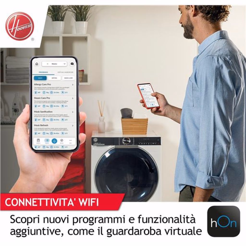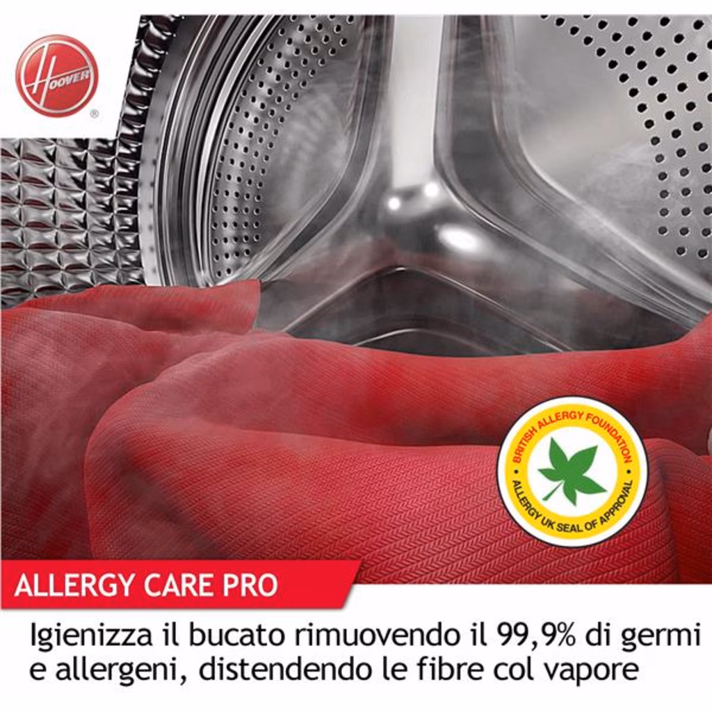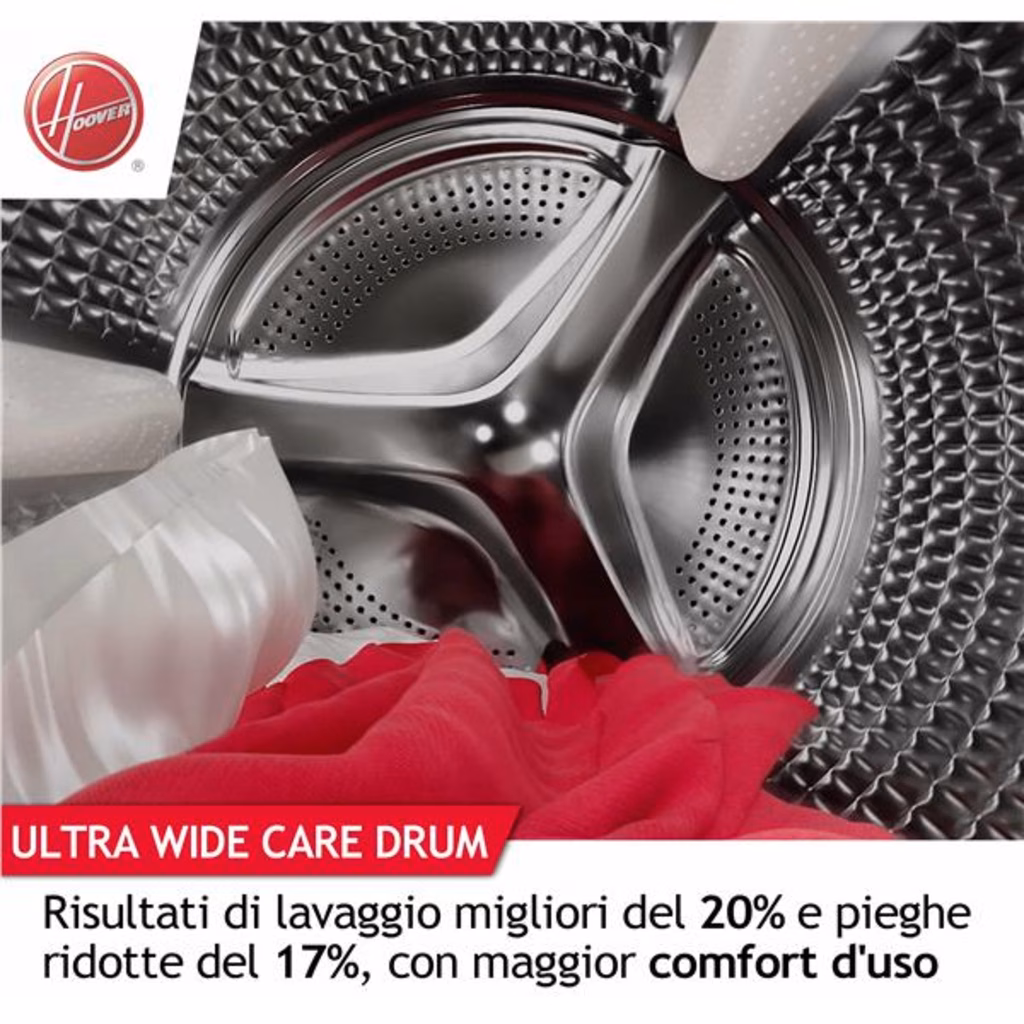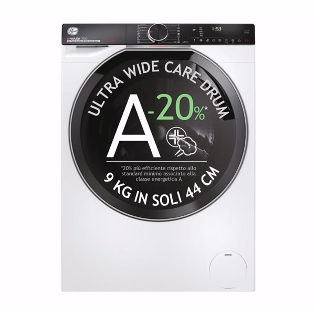 Hoover H-WASH 700 H7W4 49MBC8-S lavatrice Caricamento frontale 9 kg 1400 Giri/min BiancoH-WASH 700 H-WASH 700 è la lavatrice in Classe Energetica A-20% che garantisce risultati di lavaggio eccezionali, massimo risparmio, cura e igiene per tutti i tipi di tessuti. Grazie all'esclusivo cestello Ultra Wide Care da 525mm e alla sua superficie pillow , performance elevate sono assicurate; inoltre, permetteranno di conservare i tuoi capi più a lungo. L app hOn connessa al prodotto permette di impostare automaticamente il ciclo di lavaggio adatto in base al carico e alla tipologia di bucatoClasse A, ma 20% più efficienteQuesta lavatrice ha migliorato la Classe A del 20%*. Riduce i consumi di almeno il 48% rispetto a una Classe D, contribuendo a risparmiare energia, denaro e rispettando l'ambiente. *rispetto al valore limite della Classe A come da Regolamento Delegato (UE) 2019/2014 della CommissioneMassima puliziaGrazie al cestello Ultra Wide Care, largo 52cm, H-WASH 700 riesce ad avere un raggio d'azione molto ampio, tale da garantire una pulizia accurata dei tuoi capi. Il cestello più ampio permette ai capi di muoversi all'interno, consentendo al detergente di agire più efficacemente, riducendo l'attrito e la formazione di pieghe. Inoltre, la superficie innovativa, senza giunture grazie alla saldatura laser garantisce la massima cura e protezione dei tuoi capi durante i cicli di lavaggio.Stop agli sprechi di detersivoGrazie alla tecnologia Eco Doser, H-WASH 700 è in grado di consigliare la corretta quantità di detersivo sulla base del carico. Questa funzionalità può essere utilizzata con il detersivo liquido o in polvere, per ottenere dei risultati di lavaggio perfetti senza sprechi.Risultati migliori senza sprechiIl programma Auto Care offre i migliori risultati senza sprechi. Un avanzato algoritmo calcola e imposta automaticamente il programma più indicato, adattando la quantità di detersivo, acqua e tempo in base alle fibre e al carico.Massima efficienzaGestire al meglio i consumi è ora possibile. KG Mode Plus un nuovo algoritmo intelligente regola l'acqua, l'energia e il tempo in base al carico per prestazioni ottimizzate in qualsiasi circostanza di lavaggio.Addio errori di lavaggioGrazie alla funzione Scan to Care puoi dimenticare tutte le etichette dei tuoi capi! Scatta loro una foto e crea il tuo guardaroba virtuale. L'App hOn raccoglie e memorizza tutte le istruzioni di lavaggio, suggerendoti il ??miglior programma per prenderti cura dei tuoi capi.Prenditi cura dei tuoi capiPrenditi cura dei tuoi capi e delle loro fibre grazie al ciclo Steam Care Pro, che diffonde un flusso di vapore all'interno del cestello per rimuovere gli odori e ammorbidire le fibre.Ciclo di lavaggio a 60° per pulizie profondeIl programma Hygiene della lavatrice Hoover è uno specifico ciclo di lavaggio igienizzante che mantiene i 60° C di temperatura per oltre 20 minuti, consentendo una pulizia profonda di vestiti e indumenti.Cicli Care: vestiti ancora più curatiPrenditi cura dei tuoi capi preferiti e preservane le fibre grazie ad un set di Cicli Care progettati per ogni tipologia di indumento.Il giusto consiglio per un bucato perfettoCon la nuova funzione di lavaggio guidato puoi avere il programma perfetto che si adatta alle tue esigenze! Segui pochi passaggi e inserisci le informazioni necessarie (tessuto, colore, livello di sporco ed eventuali macchie), l'app ti suggerirà il ciclo migliore e l'impostazione per avviarlo. Inoltre, potrai avere accesso a utili consigli di lavaggio sul trattamento delle macchie e sul significato delle etichette dei capi!Performance eccellentiH-WASH 700 dispone del motore Permanent Magnet Brushless, la tecnologia più duratura, potente ed efficiente disponibile sul mercato.