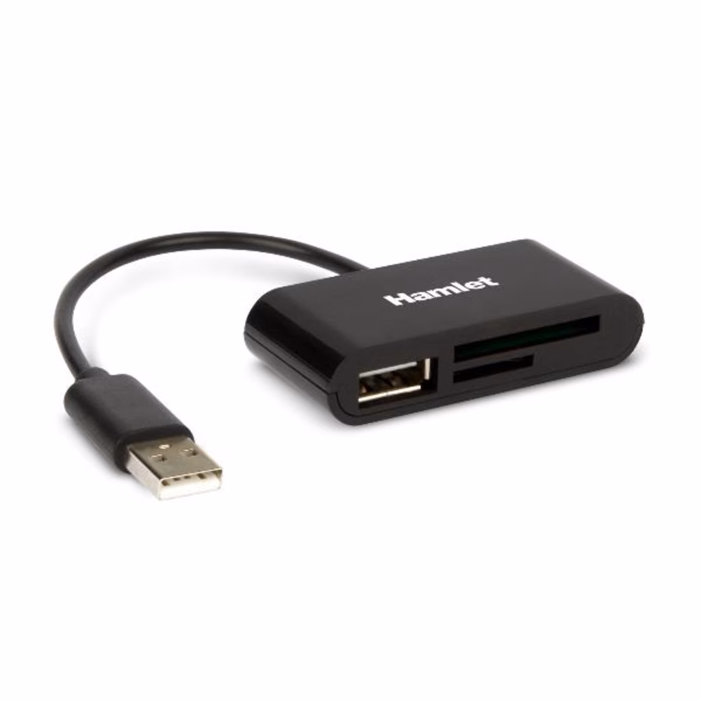 Hamlet Memory Reader è un lettore di memorie SD e MicroSD combinato con una porta USB 2.0 Tipo A ideale per collegare dispositivi USB come mouse e tastiera o per ricaricare smartphone e tablet. L'interfaccia USB-A consente di collegarlo a qualsiasi notebook o  computer dotato di porta USB standard.