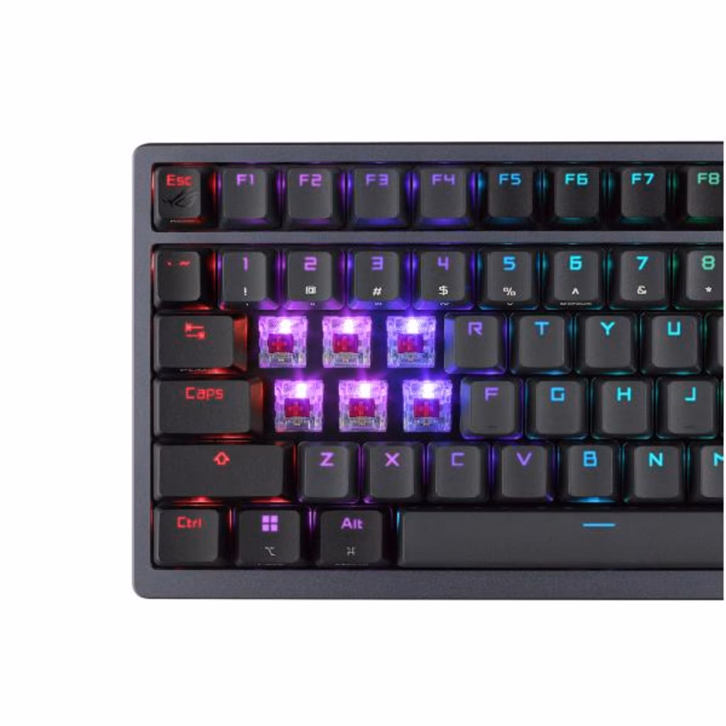 ROG Azoth è una tastiera gaming al 75% con caratteristiche DIY tradizionalmente presenti nelle tastiere personalizzate di alto livello. La cover superiore in metallo con guarnizione in silicone e smorzamento a tre strati, interruttori in dotazione che si combinano per creare esperienze di digitazione senza precedenti.