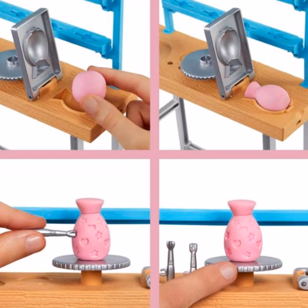 Unisciti a Barbie® nello Studio d'Arte Creatività e Relax Barbie®! I bambini possono imparare a concentrarsi e rilassarsi creando ceramiche e dipingendo! Inizia con la pasta da modellare Barbie®: estraila dalla confezione e crea una pallina. Posiziona la pasta nello stampo da vaso. Premi e scopri la tua nuova creazione! Posiziona il vaso sul disco girevole e scegli un timbrino (cuoricini o stelline). Gira il disco per imprimere il motivo sulla pasta da modellare e, a lavoro finito, esponi con orgoglio la tua creazione sulla mensolina. Immergi il pennello spugnetta in acqua fredda e dipingi le miniature di colore bianco per creare un capolavoro: sul maialino appariranno delle macchie blu sul dorso, il piatto a forma di cuore si riempirà di cuoricini rosa e gli occhi dell'orsacchiotto diventeranno viola. Mettili sullo scaffale e ammira le tue creazioni! I bambini possono continuare a creare con la pasta da modellare per ore e ore di gioco! Anche Barbie® può fingere di dipingere di fronte al cavalletto su due diverse tele colorate. Il playset include una bambola Barbie® con ginocchia snodate e oltre 25 accessori per creare: un cavalletto, 2 tele, una postazione di lavoro, uno sgabello, 4 vasetti di pittura, 2 barattolini di pasta da modellare Barbie®, 3 strumenti per decorare, 1 pennello spugnetta, 1 tavolozza di colori, 3 miniature cambia colore e 7 miniature aggiuntive per creare storie sempre diverse. La bambola non può reggersi in piedi da sola. Colori e decorazioni possono variare. Da 3 anni in su.
