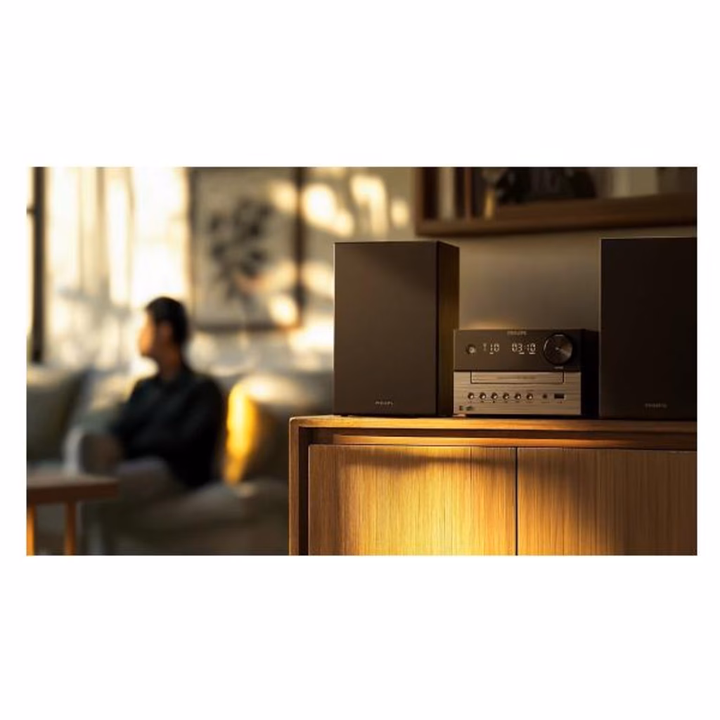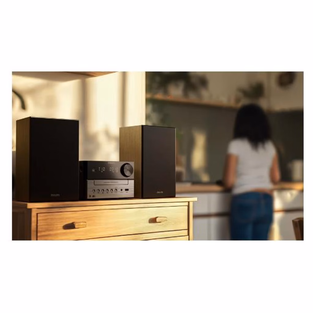Con questo microsistema compatto e gli altoparlanti da scaffale, scoprirai un audio stereo eccellente da qualsiasi sorgente! Sintonizzati sulla radio DAB+ dalla nitidezza cristallina, riproduci in streaming musica e podcast, ascolta CD o collegati ad altre sorgenti tramite USB o ingresso audio.