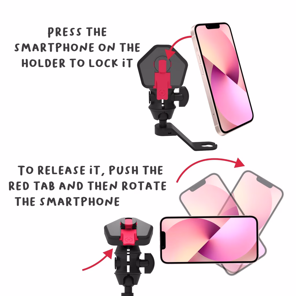 La testina di SNAPMIRROR è regolabile in inclinazione e può essere ruotata a 360° in modo da usare lo smartphone sia in verticale che in orizzontale.