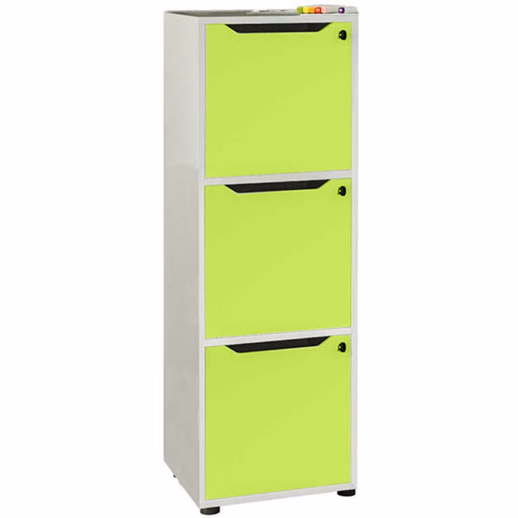 Materiale bilaminato nobilitato melaminico spessore conforme norme UNI e EN classe E1, antigraffio ed antiriflesso. Programma di contenitori a 3 caselle allestibili a giorno oppure con ante complete di serratura. Ideali sia per larchiviazione di documenti che in tutti quei contesti in cui è opportuno offrire la possibilità di lasciare oggetti personali custoditi allinterno di un vano chiuso a chiave. Il design delle ante permette, anche da chiuse, di inserire documenti allinterno della casella. Utilizzabile anche come casellario. Le singole caselle misurano 372x372 mm (L x H) e complete di ante hanno una profondità utile di 366 mm. Dotate di piedini livellabili in altezza. Modelli e dimensioni:  3 caselle: L410 P400 H1206 mm Top sp. 18 mm. Fianchi, ripiani e base sp. 18 mm. Dietro sp. 10 mm Ante sp. 18 mm.