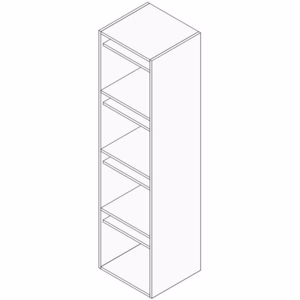 In agglomerato ligneo nobilitato melaminico finitura bianco. Fianchi terminali e intermedi, coperchi, fondi, ripiani e schiene spessore 18 mm. A quattro vani a giorno. Dimensioni cm 48,7x45,2x189,6