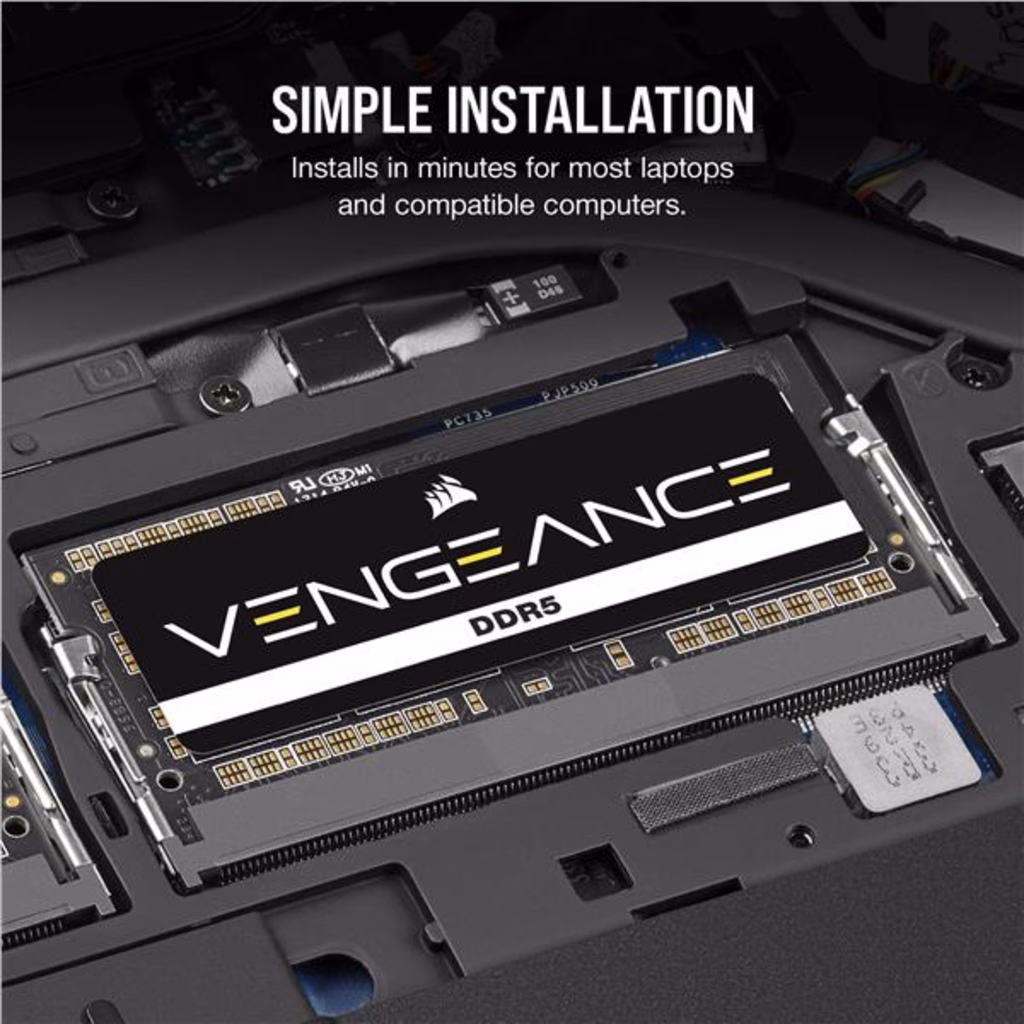 Corsair Vengeance CMSX32GX5M1A5600C48 memoria 32 GB 1 x 32 GB DDR5WIDE COMPATIBILITY Compatible with a wide range of popular Intel® and AMD® gaming and performance laptops, small-form-factor PCs, and Intel NUC kits. Installs in minutes for most laptops and compatible computers. TUNED FOR MAX SPEED Automatically sets to maximum speed on compatible systems for faster load times, multitasking, and more. No BIOS configuration required to take advantage of higher speed just install and go. RIGOROUSLY TESTED RELIABILITY Each module is rigorously screened and thoroughly tested in extreme conditions to ensure superior performance and reliability.