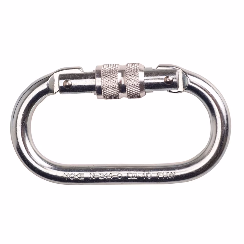 Moschettone in acciaio con chiusura di sicurezza a vite - lunghezza mm 106, apertura mm 19 - carico rottura 25 kN - certificazioni: EN 362