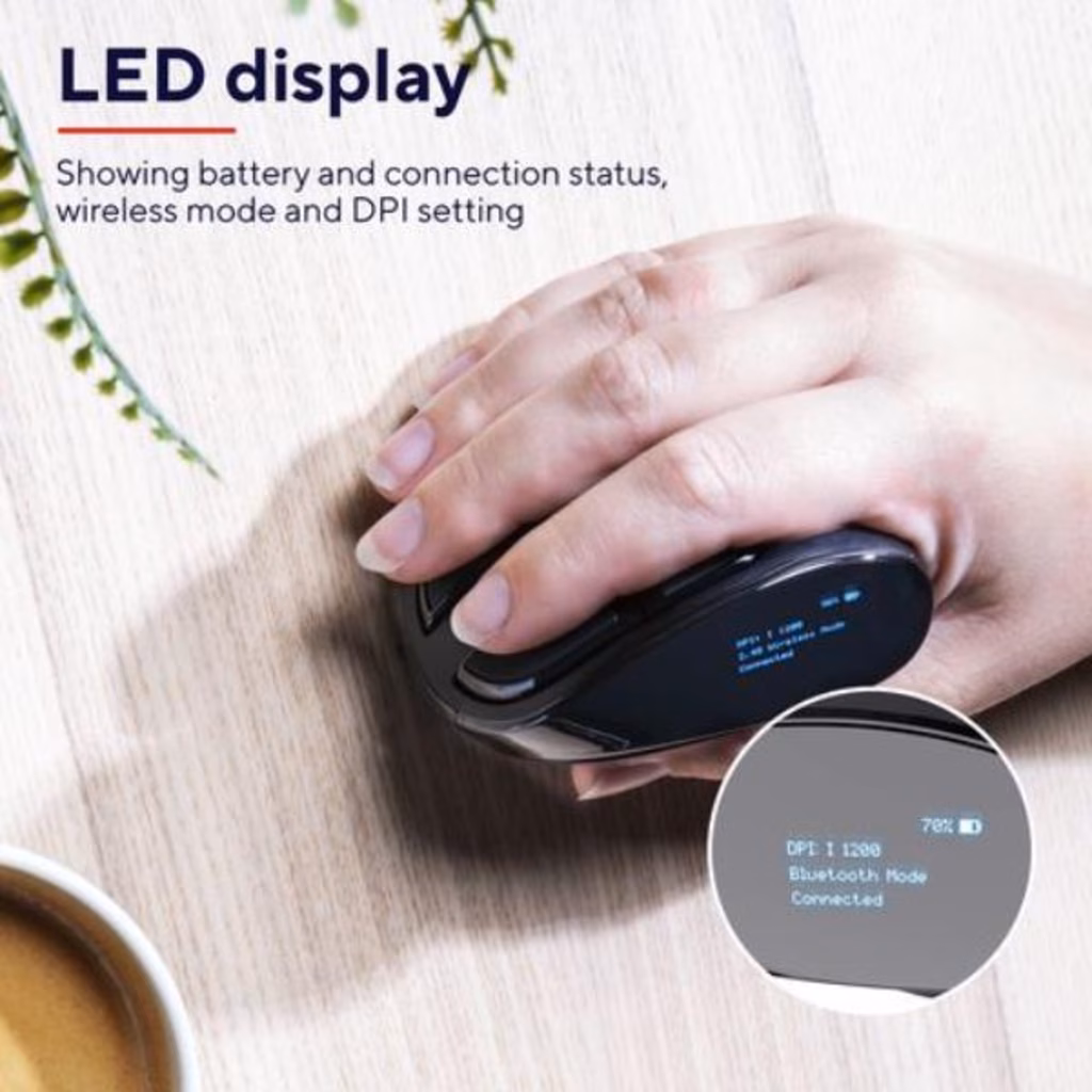Un mouse wireless ricaricabile con display digitale e design ergonomico verticale per offrire il comfort ottimale. Un design ergonomico verticale garantisce un posizionamento più naturale della mano, riducendo la tensione sul braccio e sul polso. Lavora senza fili tramite un ricevitore USB riponibile o il Bluetooth, ricavandoti così tutto lo spazio che ti serve per lavorare senza fastidiosi fili.