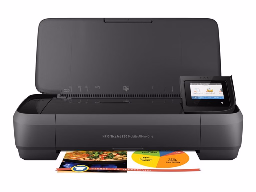 Stampante All-in-One portatile HP OfficeJet 250 (CZ992A).Eseguite stampe, scansioni e copie ovunque, grazie a questa All-in-One portatile. Facile connessione alla stampante con Wi-Fi Direct®. Questo potente e silenzioso dispositivo è dotato di una batteria a lunga durata e offre un numero incredibile di pagine.