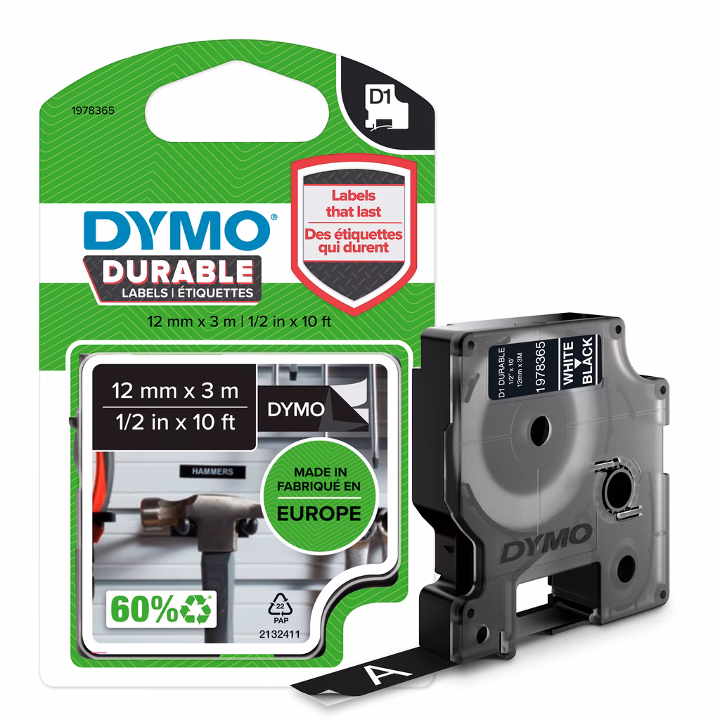 Nastro DYMO D1 Durable - 12 mm x 3 m - Bianco/Nero - PERMANENTE. Le etichette DYMO® D1® sono dotate di adesivo di grado industriale e resistono a sbiadimento, distacco e abrasione dovuti a luce, calore, umidità e detergenti domestici. Le etichette DYMO® D1® Durable sono perfette per cucine, garage, attrezzature sportive, stoccaggio all'aperto e molto altro. Non ecologico.