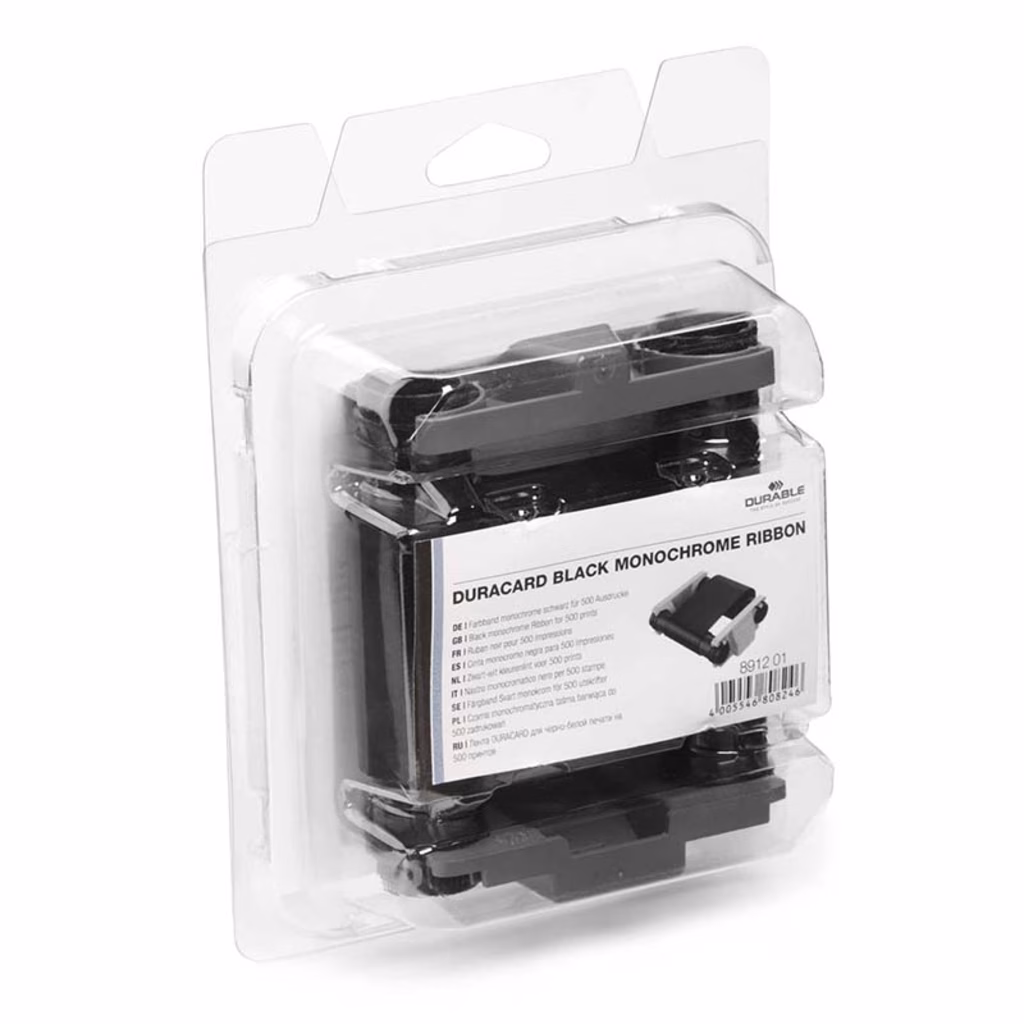 Nastro di stampa nero per la stampa di 500 tessere di plastica. Il blocco nastro è dotato di tecnologia di codifica RFID per garantire un veloce riconoscimento dei nastri originali per la stampa da parte della stampante DURACARD ID 300. Il formato compatto dei nastri ne agevolano il ricambio. I nastri monocromatici sono importanti per la personalizzazione di card a basso costo senza sacrificare la qualità di stampa.