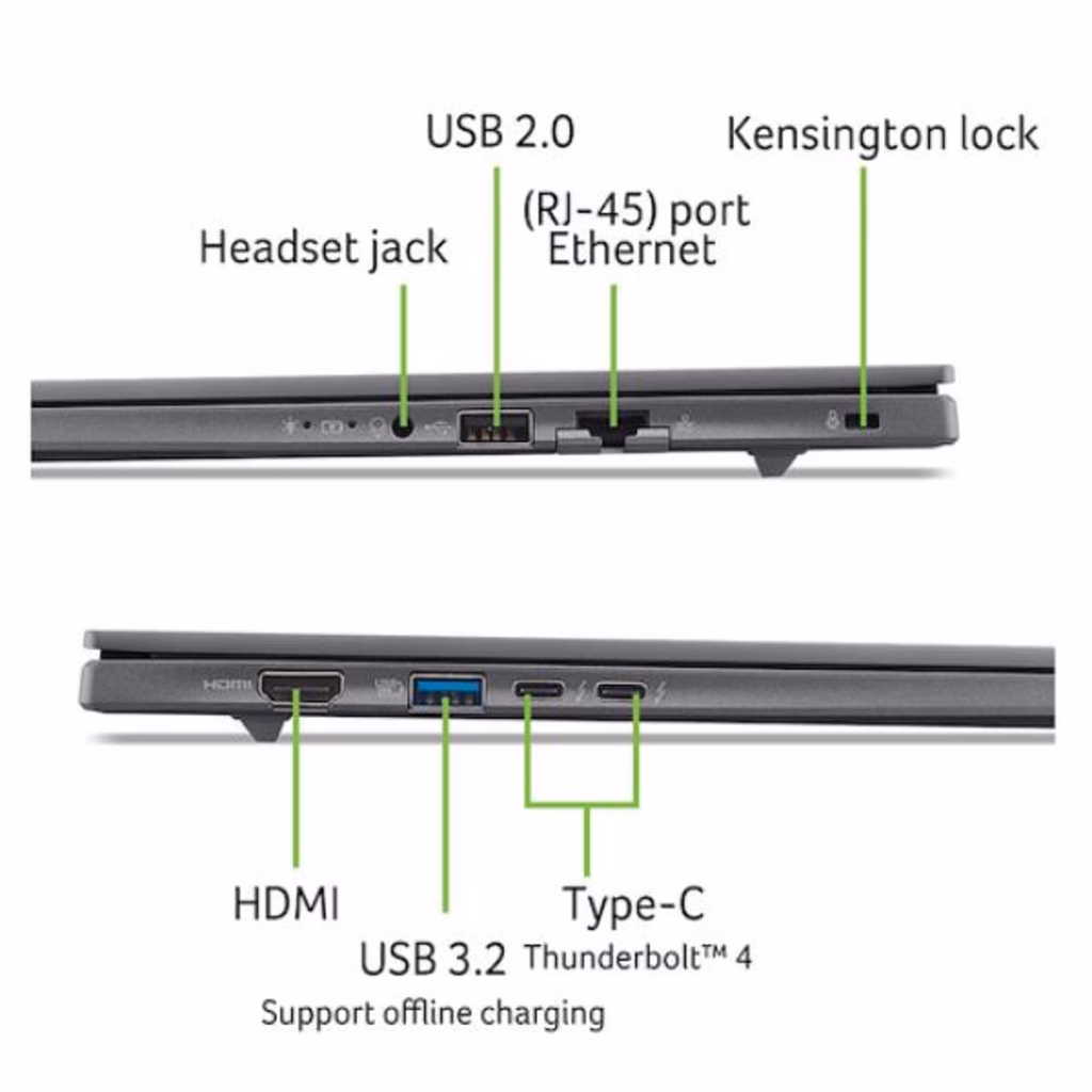 TravelMate X4 14 AI è dotato di due porte Thunderbolt 4, una porta USB 3.2 Type-A, una porta USB 2.0 Type-A, HDMI 2.1 e una porta