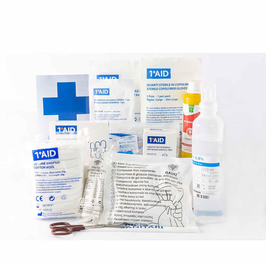 Contenuto: 1 copia Decreto Legislativo n° 81/ 2008 - istruzioni per luso dei presidi contenuti e per le prestazioni dei primi soccorsi in attesa dei servizi d'emergenza - 125 ml di soluzione cutanea di iodopovidone al 10% - 250 ml di soluzione fisiologica (sodio cloruro 0,9%) iodio - 2 paia di guanti sterili monouso - 3 compresse di garza sterile cm 10x10 in buste singole - compressa di garza sterile cm 18x40 in buste singole - 1 pinzetta da medicazione sterile monouso - 1 confezione cotone idrofilo -  1 confezione da 10 cerotti di varie misure pronti all'uso - 1 rotolo di cerotto alto cm 2,5x 5 m - 1 rotolo di benda orlata alta cm 10x5 m - 1 paio di forbici - 1 laccio emostatico - 1 confezione di ghiaccio pronto uso - 1 sacchetto monouso per la raccolta di rifiuti sanitari