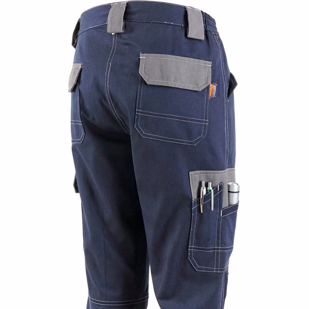 Pantalone lavoro "Globo" con bottoni coperti - elastici laterali in vita - due tasche anteriori - due tasche posteriori con velcro - tascone con pattina su gamba sinistra - doppia tasca applicata su gamba destra - aperture per inserimento protezioni alle ginocchia