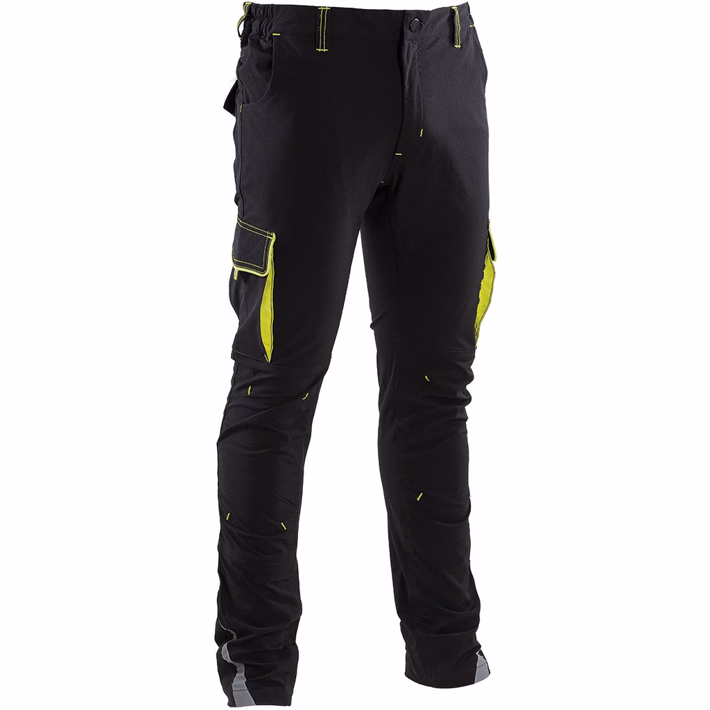 Pantalone in tessuto bielastico 90% nylon 10% spandex con elastico ai fianchi, dettagli rifrangenti sul fondo gamba, ginocchia preformate, chiusura centrale con cerniera e bottone, 2 tasche anteriori applicate, doppio tascone laterale con pattina chiuse con velcro e soffietti, 2 tasche posteriori chiuse con pattina e velcro, tirapattine e doppie cuciture nei punti di maggiore sforzo.