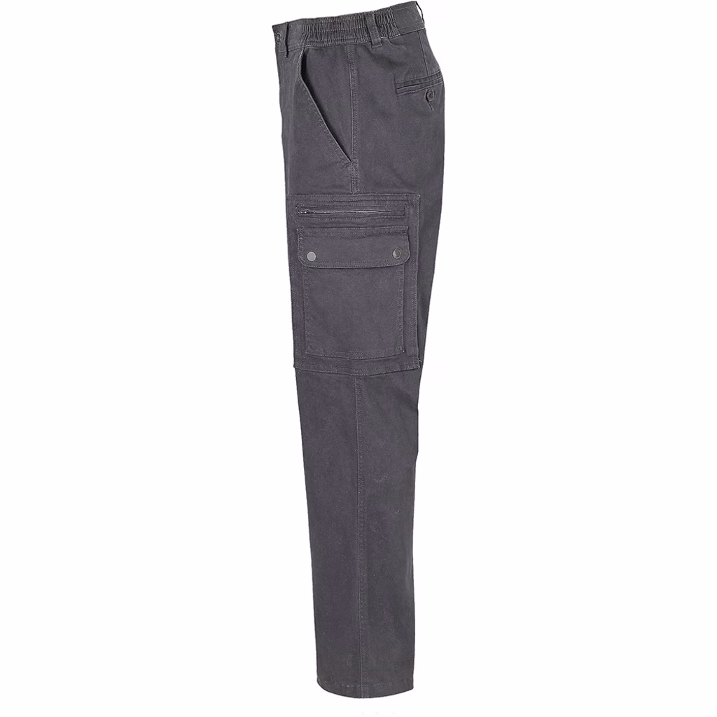 Pantalone twill 98% cotone - 2% elastan apertura con zip e bottone in metallo vita elasticizzata con passanti rinforzati 2 tasche laterali all'italiana 1 tasca applicata con zip sulla gamba sinistra 2 tasche laterali applicate con patta e bottoni a pressione 2 tasche posteriori a filetto con patta