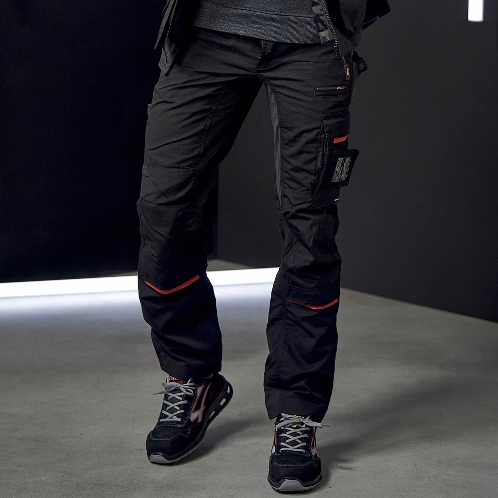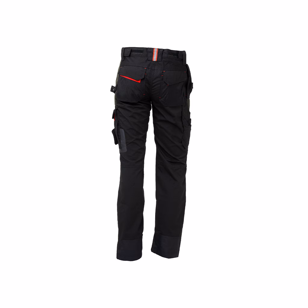 Pantalone dotato di tasca removibile fly pocket, 2 ampie tasche anteriori, tasca invisibile, tasca laterale portautensili, tasca laterale multifunzionale, 2 Free Pocket posteriori in Cordura® con chiusura di sicurezza a velcro, 2 tasche porta ginocchiera in Cordura® con interno elasticizzato; porta martello regolabile; regolazione in vita con elastico per massimo comfort, fettuccia portachiavi brandizzata. Inserti stretch ad alta vestibilità ed ergonomici, inserti in tessuto Cordura® e antiabrasivo nelle zone di massimo contatto, inserti reflex. Supporti di rinforzo per velcri, triple cuciture. Bottone antigraffio, zip YKK. 65% poliestere 35% cotone, Canvas 260 gr/m².