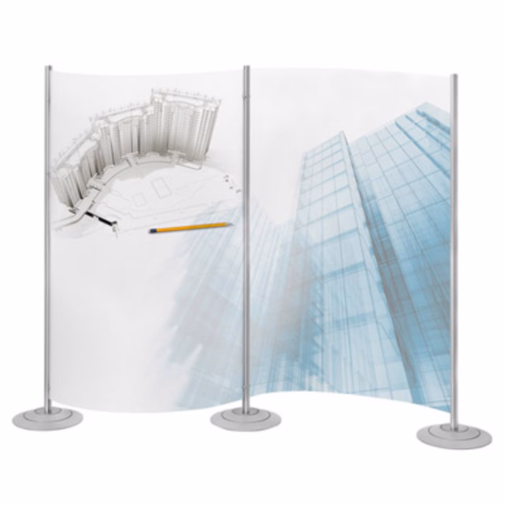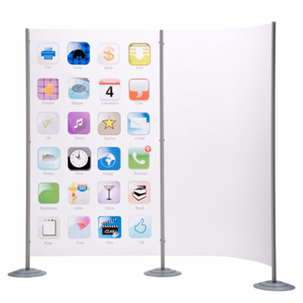 Sistema flessibile di paretine divisorie autoportanti semplici da montare che permettono una suddivisione ottimale di qualsiasi spazio e soluzione open space. I pannelli sono in polipropilene flessibile, sostenuti da montanti in alluminio. Modulo singolo autoportante. È possibile fare composizioni a più pareti aggiungendo al modulo base quello aggiuntivo. I pannelli possono essere stampati con una grafica qualsiasi. Colori: montanti silver e pannello bianco opalino. Modulo aggiuntivo cm L150 H180. Area grafica cm 100x170.