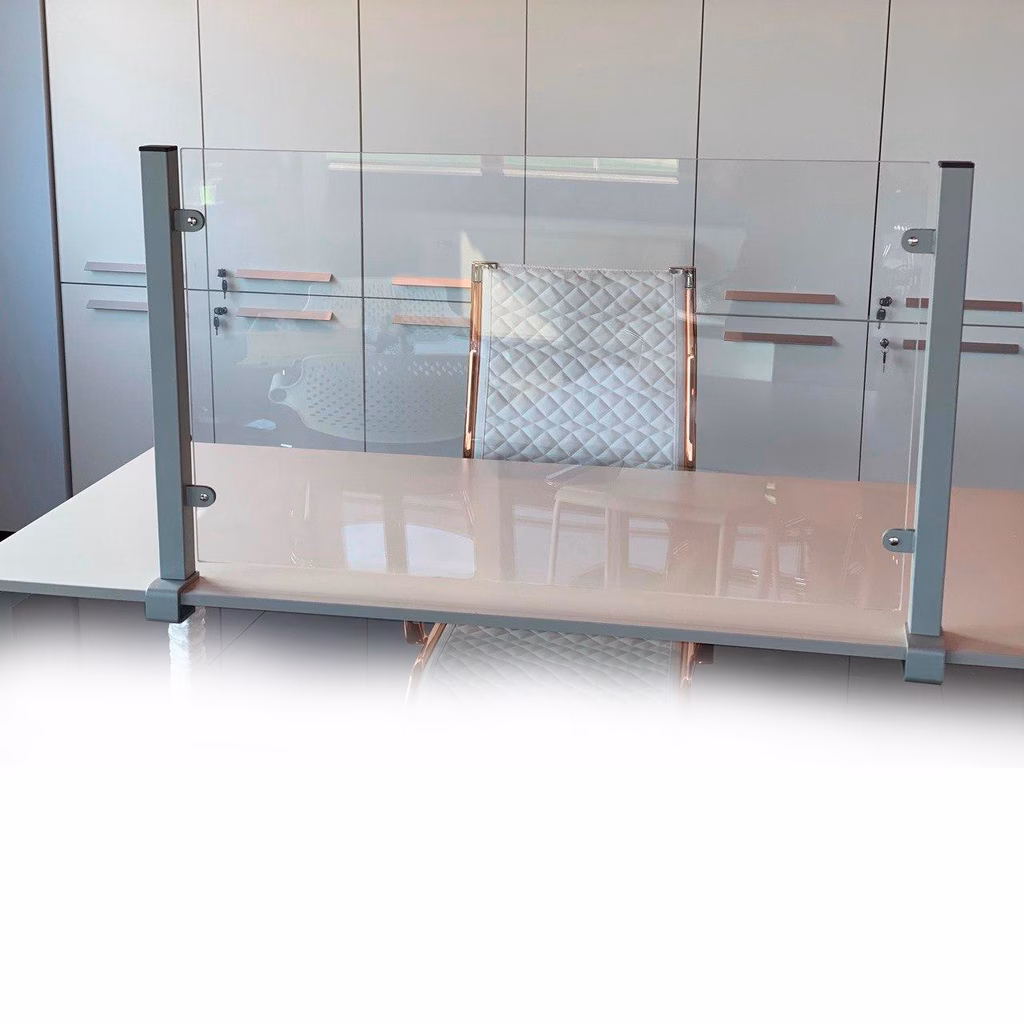 Peretina L110 regolabile in altezza (min.60cm max 70cm ( tra piano e plexiglass min. 3cm max 13cm). Telaio con 2 montanti laterali sezione 35x35 in acciaio verniciato grigio chiaro e pannello di plexiglass trasparente spessore 5 mm + N° 2 supporti laterali. Fornito già montato in scatola e pronto alluso. Con adesivi di segnalazione del vetro allinterno della scatola. Versione con fissaggio al piano tramite morsetti