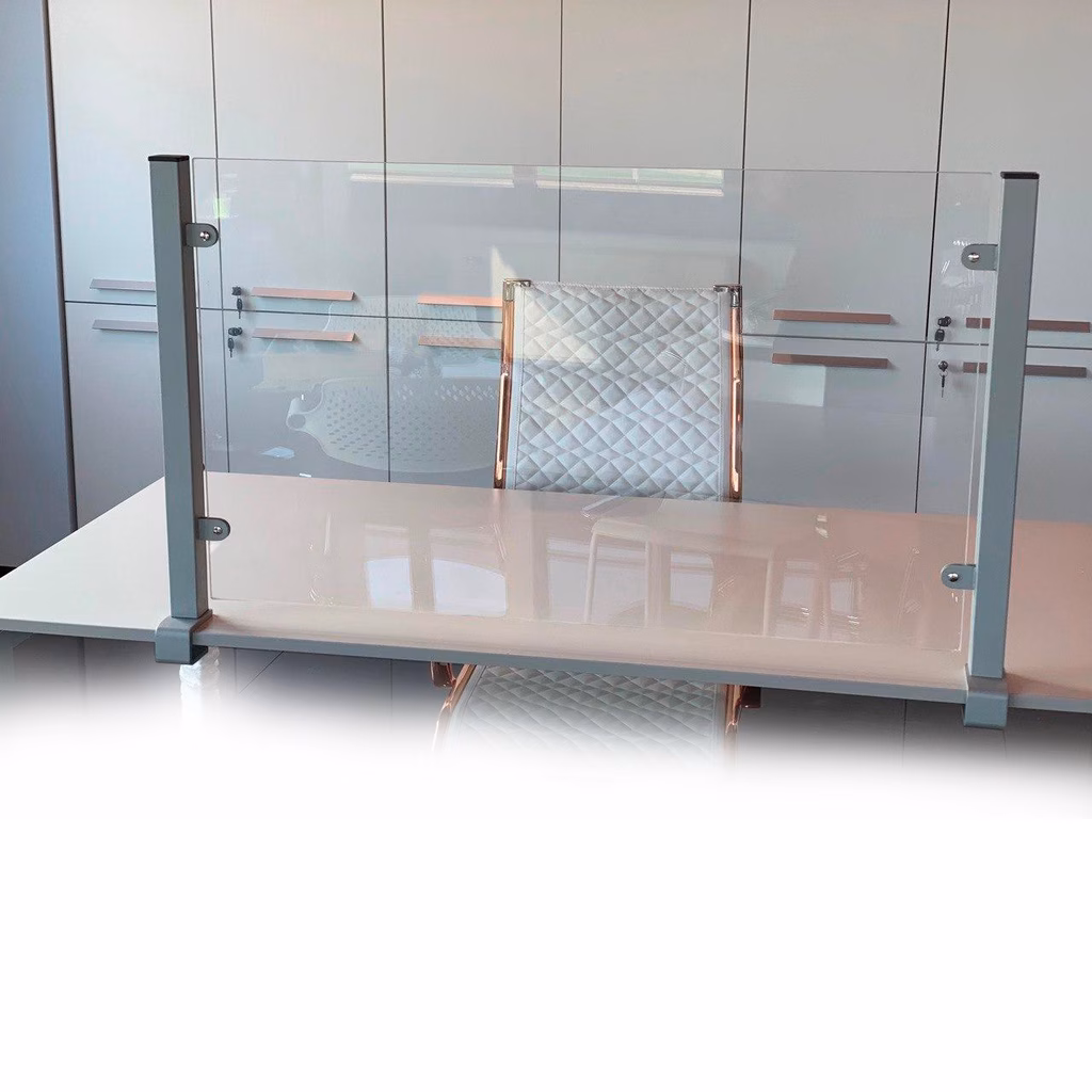 Peretina L120 regolabile in altezza (min.60cm max 70cm ( tra piano e plexiglass min. 3cm max 13cm). Telaio con 2 montanti laterali sezione 35x35 in acciaio verniciato grigio chiaro e pannello di plexiglass trasparente spessore 5 mm + N° 2 supporti laterali. Fornito già montato in scatola e pronto alluso. Con adesivi di segnalazione del vetro allinterno della scatola. Versione con fissaggio al piano tramite morsetti oppure in appoggio tramite basette con biadesivo compreso.