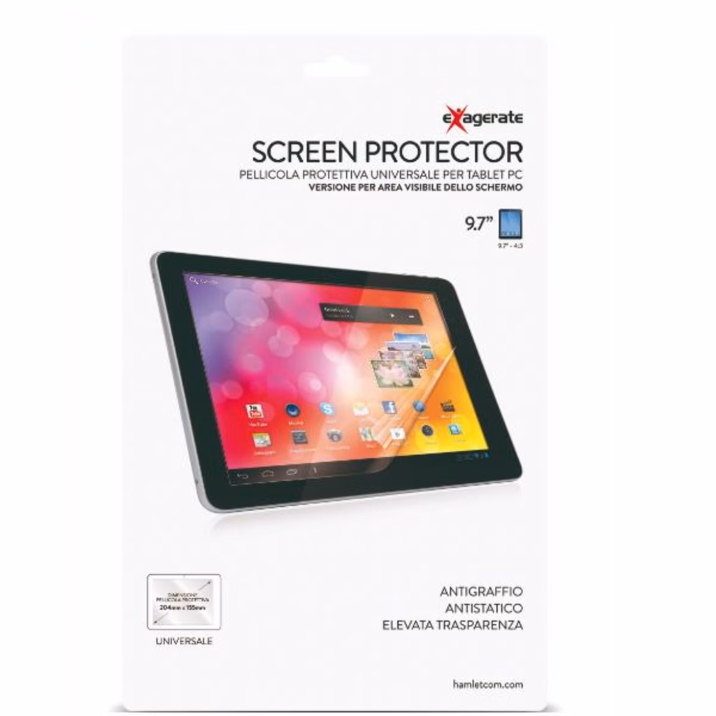 Exagerate Screen Protector è una pellicola universale per la protezione dell'area visibile dello schermo dei Tablet PC da 9.7 pollici con schermo 4:3. Permette di proteggere l'area dello schermo da graffi e ditate mantenendo un'ottima qualità di visione grazie alla sua elevata trasparenza.
