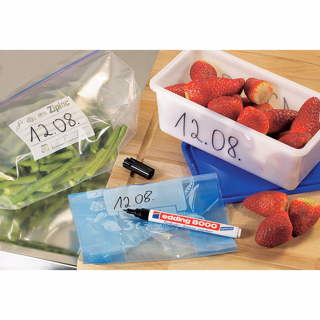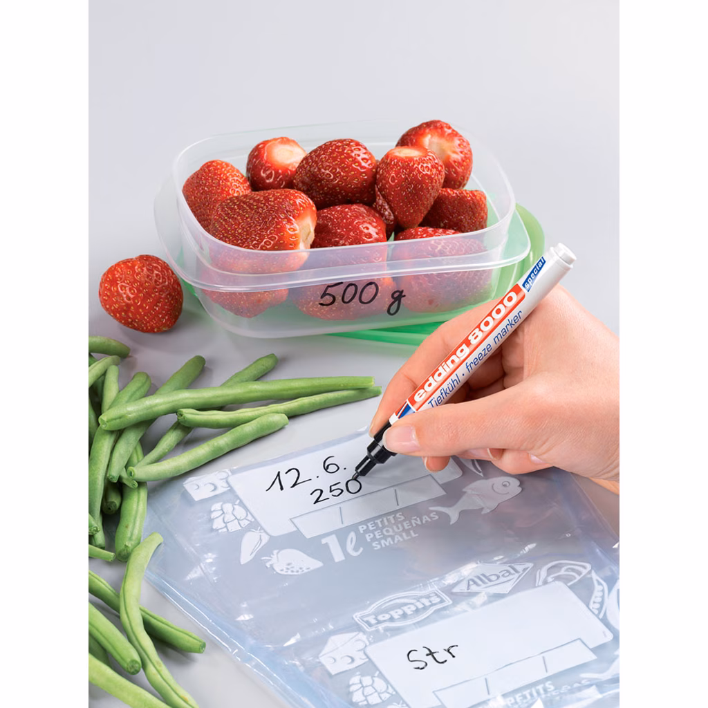 Specifico per scrivere e contrassegnare in modo indelebile ogni tipo di sacchetto e contenitore da riporre nel congelatore. Non teme temperature fino a -25°C. Inchiostro permanente a rapida asciugatura completamente atossico e privo di toulene/xilene. Cappuccio ventilato anti soffocamento secondo normativa ISO 11540. Punta fine, tratto mm 1