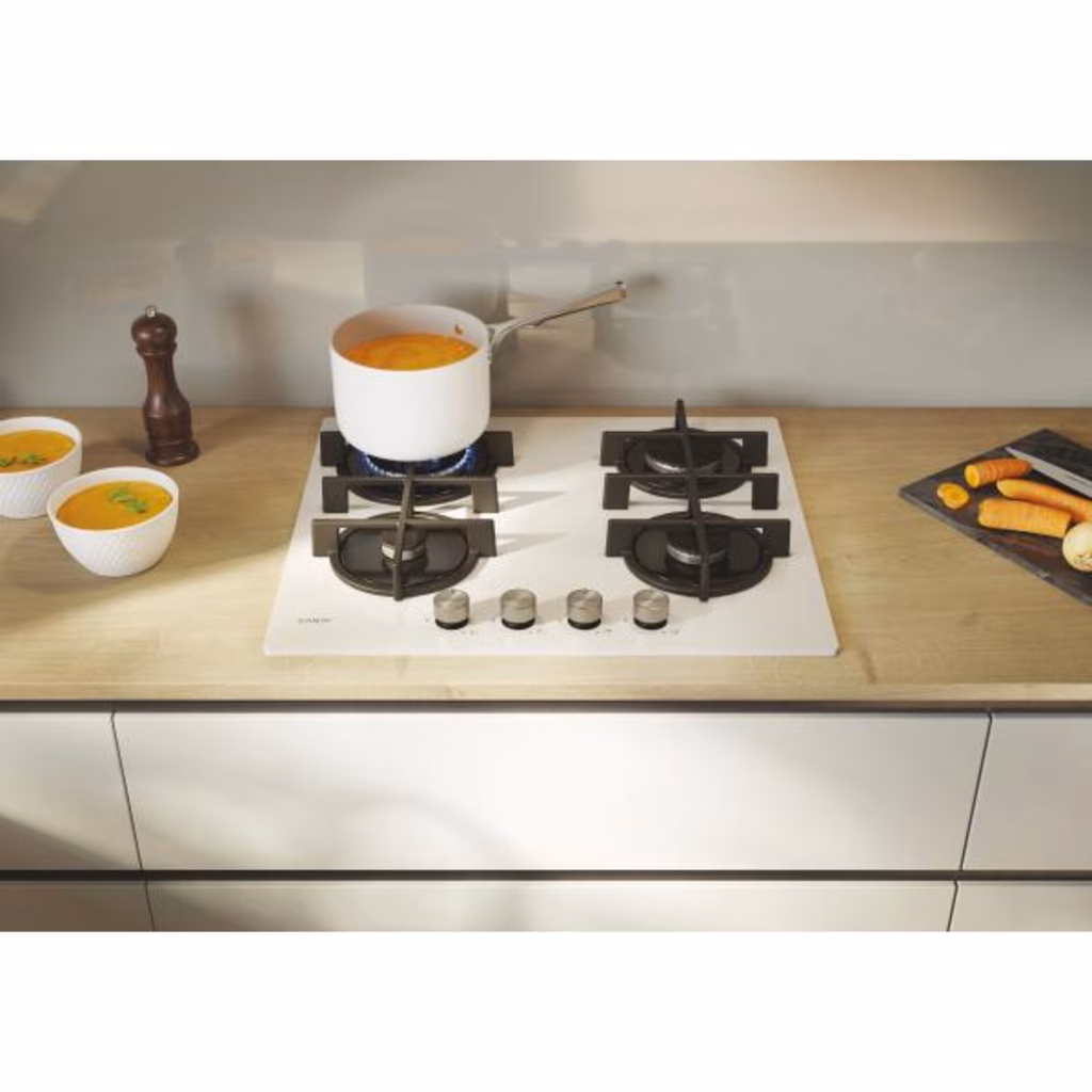Candy Moderna CVG6BR4WTW Bianco Da incasso 60 cm Gas 4 Fornello(i)Moderna Gas on Glass I piani cottura Moderna Gas on Glass sono pensati per chi ama il design moderno e innovativo in grado di abbinarsi ad ogni stile. Il piano cottura a gas su vetro offre un tocco di eleganza combinato ad una grande durata e prestazioni di alto livello. Il vetro temperato resiste ai graffi e alle abrasioni rendendo questo prodotto incredibilmente durevole nel tempo.Cottura efficiente e precisaPuò raggiungere una potenza fino a 4 KW garantendo una maggiore efficienza rispetto ai fornelli tradizionali. Particolarmente adatto per le padelle di larghe dimensioni, permette di cucinare con precisione tutti i tipi di pietanze.Trasmissione ottimale del caloreLa ghisa è un materiale molto apprezzato perché garantisce una migliore trasmissione del calore, un'ottima resistenza anche alle temperature più elevate e una lunga durata nel tempo. Una cucina professionale, a casa tua.Basta lavare a mano le griglie!Non perdere tempo a lavare a mano le griglie del tuo piano cottura! Tutte le nostre griglie sono lavabili in lavastoviglie, consigliamo una temperatura di lavaggio tra i 70° e i 75° per mantenere le tue griglie come nuove.Riduci i rischi di rotturaIl vetro temperato è elegante e robusto e riduce al minimo il rischio di rottura.