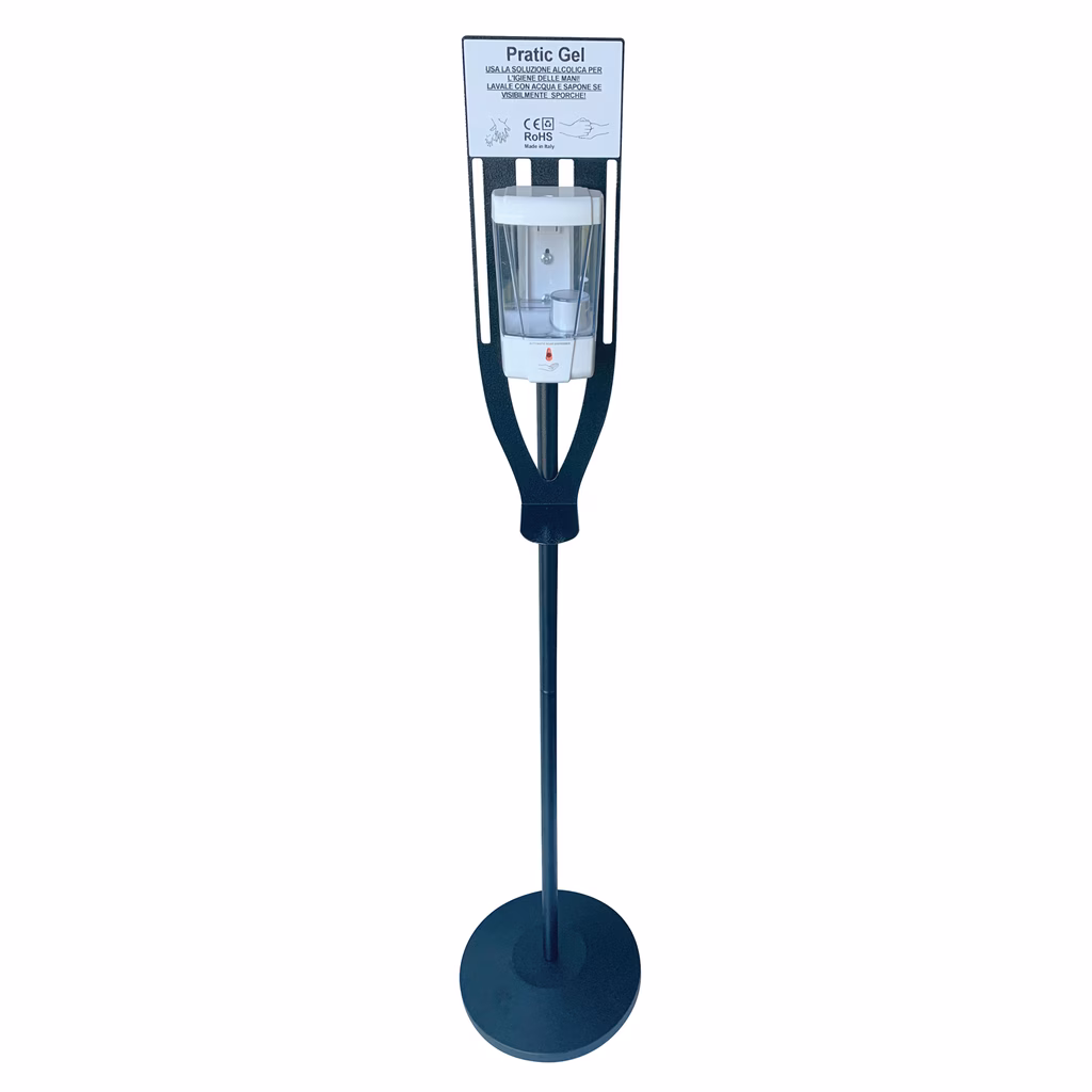 Piantana e Dispenser con fotocellula a rabbocco per interni - base diametro 33cm in metallo verniciato colore nero - struttura in metallo verniciata colore nero (altezza cm 120) - Dispenser ad erogazione automatica con sensore LD per sapone liquido e gel - Capacità max 600 ml - Dimensioni cm 11x8x19,7 (utilizza 4 batterie AA non incluse) - peso 6,4 Kg