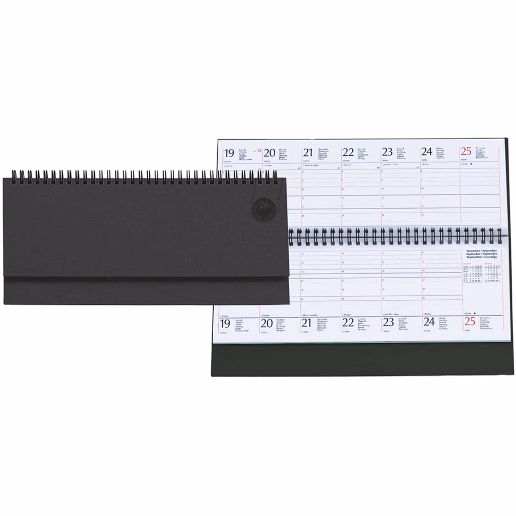 Agenda da tavolo con rilegatura a spirale metallica - copertina rigida in materiale termovirante - 128 pagine versione settimanale (stessa settimana su due pagine) stampate a 2 colori su carta usomano bianca da 70 g/m2 - rubrica telefonica - edizione multilingue - formato esterno cm 30x15